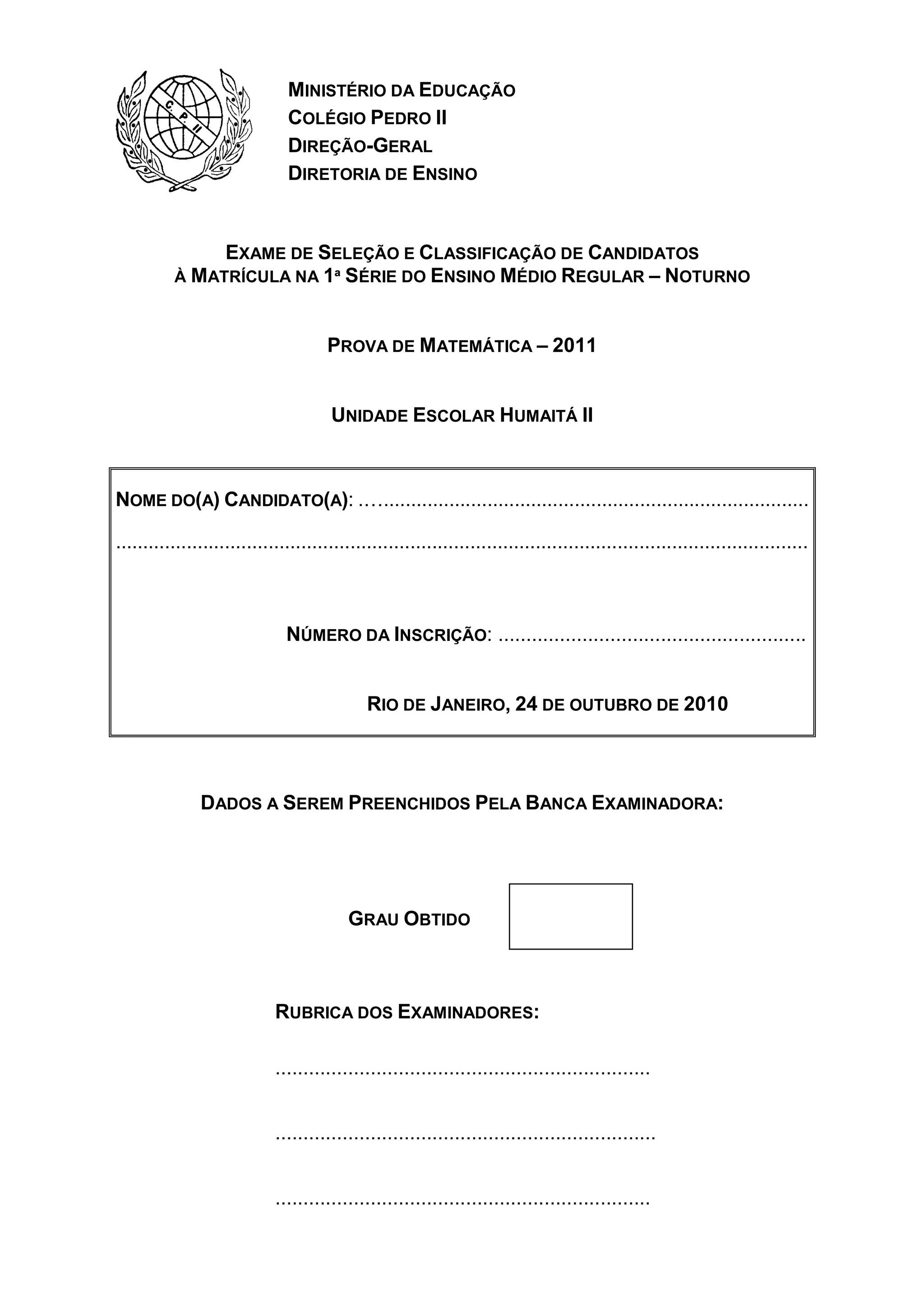 O documento é uma prova de matemática para seleção e classificação de candidatos ao ensino médio noturno do Colégio Pedro II no Rio de Janeiro em 2011. A prova contém 6 questões sobre tópicos como porcentagem, geometria, álgebra e estatística. As instruções orientam os candidatos sobre o tempo de duração da prova, os materiais permitidos e o procedimento para entrega da prova.