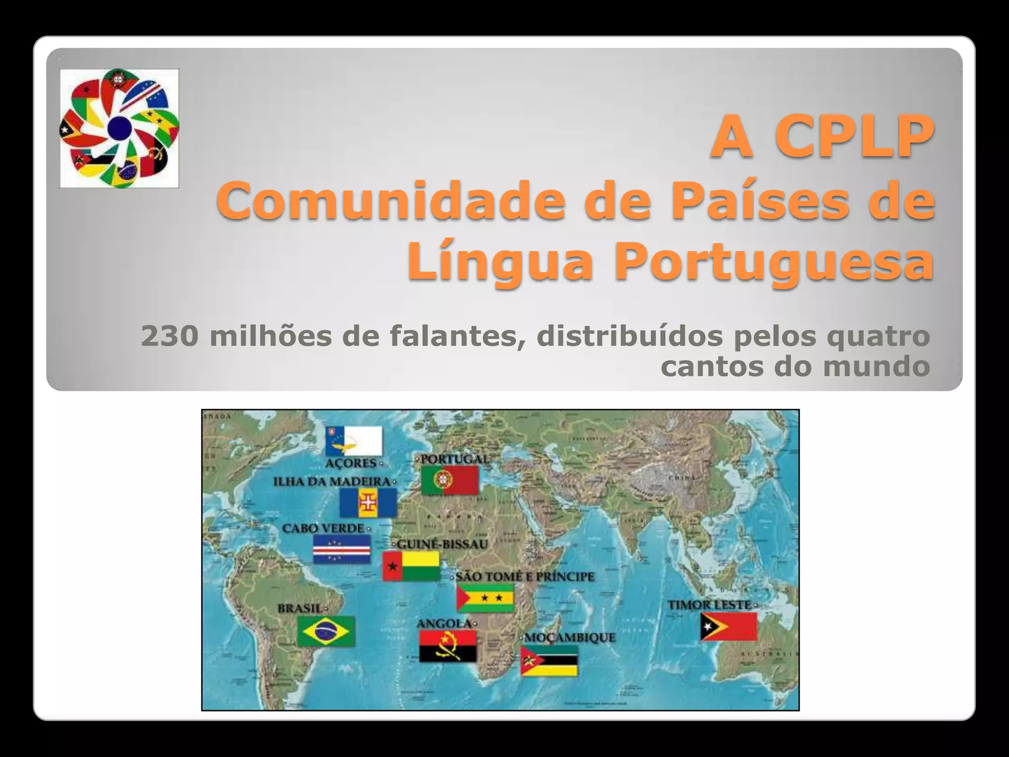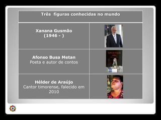 O documento fornece informações sobre vários países de língua portuguesa, incluindo Portugal, Timor-Leste, Guiné-Bissau, Angola, Moçambique, São Tomé e Príncipe e Brasil. Fornece detalhes sobre a capital, população, área, moeda e breve descrição geográfica de cada país, bem como exemplos de monumentos nacionais, música, dança e aspectos da gastronomia local.