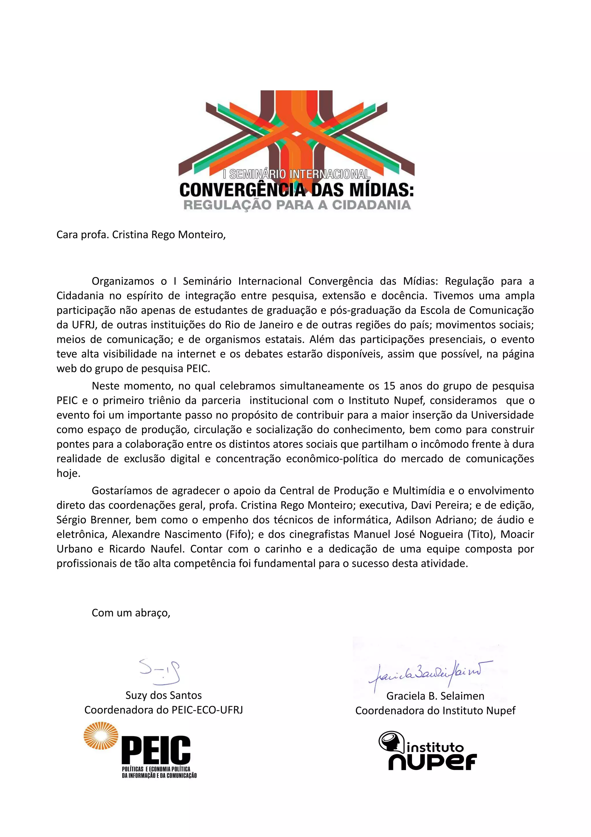 O documento descreve o I Seminário Internacional Convergência das Mídias: Regulação para a Cidadania realizado pela Escola de Comunicação da UFRJ em parceria com o Instituto Nupef. O evento teve ampla participação e visibilidade online. Os organizadores agradecem o apoio recebido da Central de Produção e Multimídia da UFRJ para o sucesso do seminário.