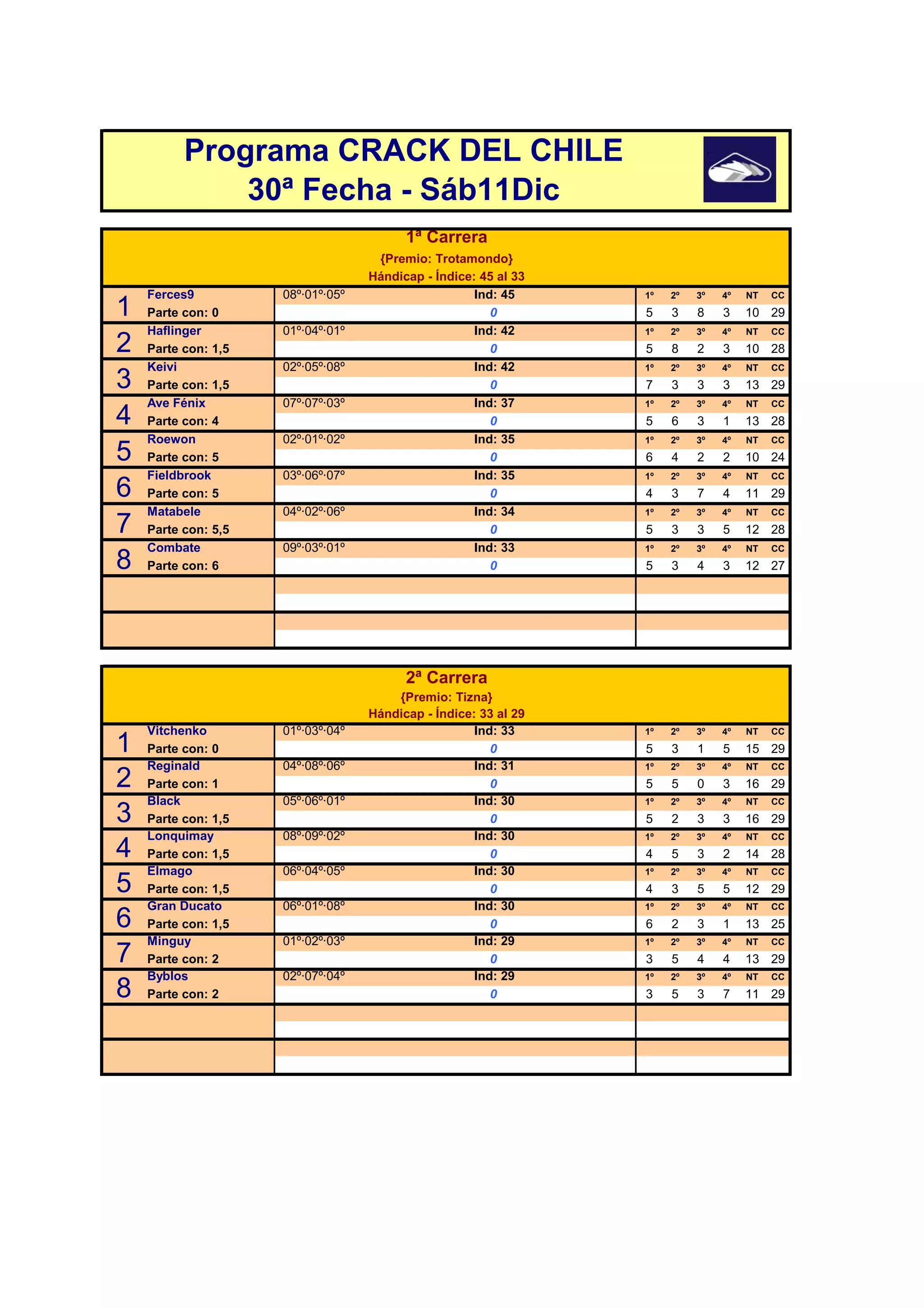 Este documento descreve cinco carreras de um programa de corridas de cavalos. Cada corrida lista os cavalos participantes com seus tempos e índices, além das apostas iniciais para cada posição de chegada.