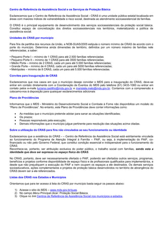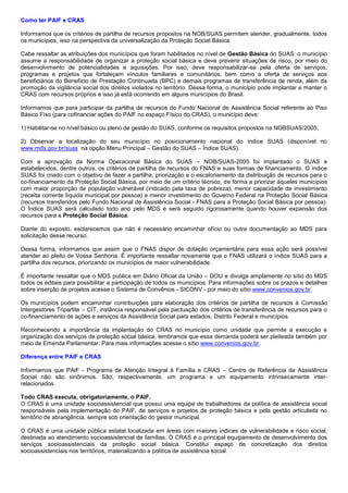 O documento fornece informações sobre o Centro de Referência da Assistência Social (CRAS) e seus serviços de proteção básica. O CRAS é uma unidade pública localizada em áreas de vulnerabilidade social para atender famílias. O documento descreve o número mínimo de CRAS por município, a equipe profissional necessária, e como o CRAS atua para fornecer serviços socioassistenciais e promover os direitos das famílias.