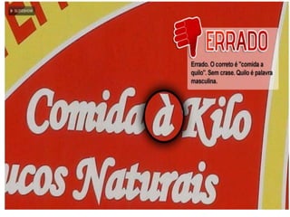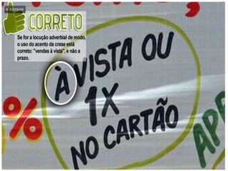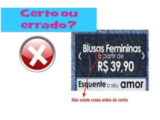 O documento apresenta as regras de uso da crase em português. Ele explica que a crase indica a fusão de duas vogais iguais e contíguas, geralmente entre uma preposição e um artigo ou determinante. A seguir, o documento detalha os casos em que ocorre ou não a crase, como antes de substantivos femininos, locuções prepositivas ou conjuntivas femininas, e indicação de horas. Por fim, fornece exercícios sobre o tema.