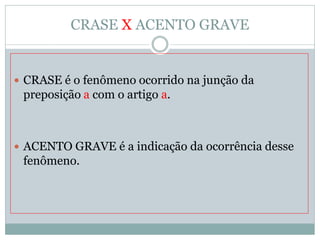 O documento explica o que é crase, como ocorre na junção da preposição "a" com artigos e pronomes, e fornece exemplos ilustrando o uso correto do acento grave.