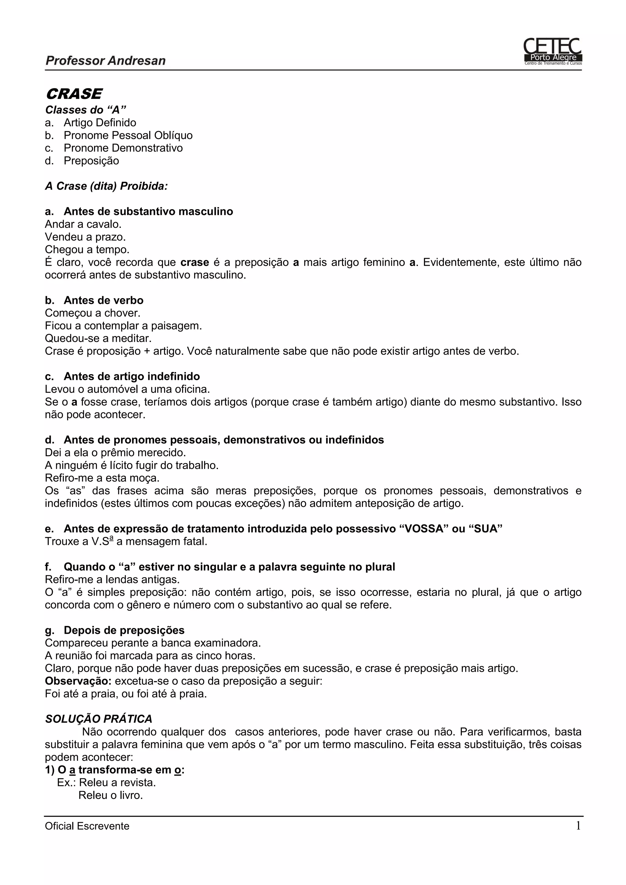 Este documento fornece instruções sobre o uso da crase em português. Discute quando a crase é permitida ou proibida antes de substantivos masculinos, verbos, artigos indefinidos, pronomes e outras situações. Também fornece exemplos de exercícios para identificar corretamente quando usar a crase.