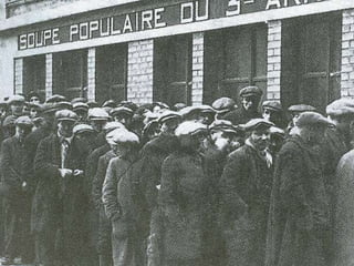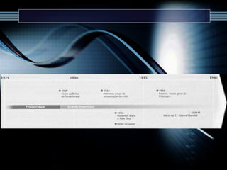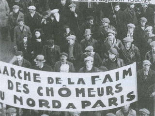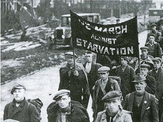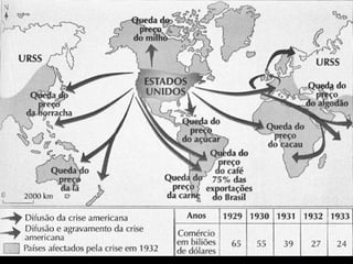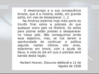 O documento descreve a prosperidade econômica dos EUA nos anos 1920, seguida pelo crash da bolsa de valores de Nova York em 1929 que desencadeou a Grande Depressão. Isso levou ao desemprego em massa, falências de bancos e empresas, e a formação de favelas chamadas "Hoovervilles". Governos em países afetados responderam com medidas como obras públicas e apoio às indústrias para estimular a economia.