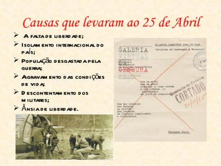 O documento descreve os eventos que levaram à Revolução dos Cravos de 25 de Abril de 1974 em Portugal. O descontentamento popular e a Guerra Colonial levaram à formação do Movimento das Forças Armadas (MFA) que planejou e executou a revolução. No dia 25 de Abril, tropas lideradas por Salgueiro Maia tomaram posições estratégicas em Lisboa, forçando a renúncia do Presidente do Conselho Marcelo Caetano e o fim do regime autoritário.