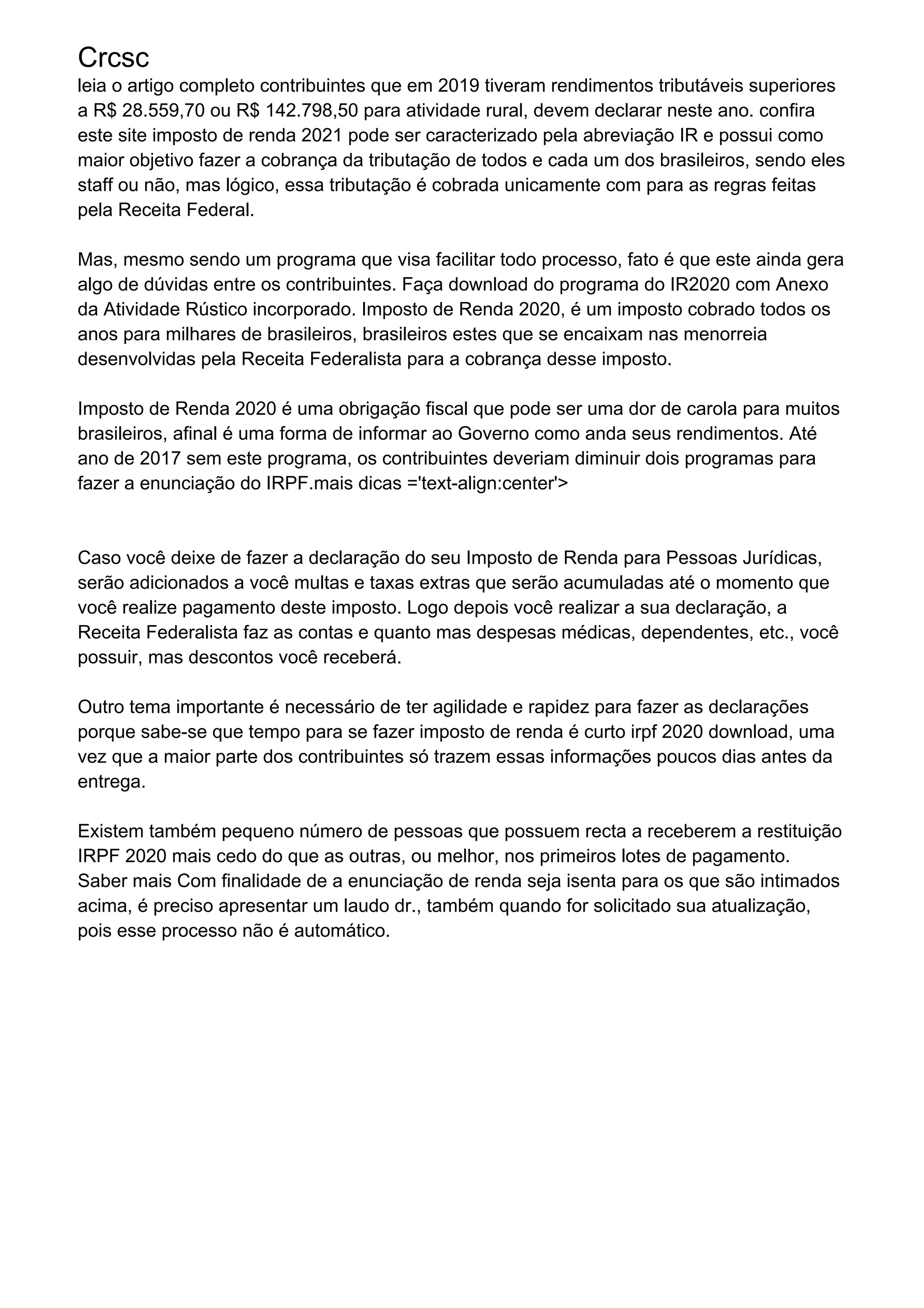 Contribuintes com rendimentos acima de R$28,559.70 ou R$142,798.50 para atividade rural devem declarar Imposto de Renda em 2021. O Imposto de Renda tem como objetivo cobrar tributos de brasileiros de acordo com as regras da Receita Federal. A declaração do Imposto de Renda gera dúvidas, e quem não declarar terá multas e juros acrescidos até a declaração.