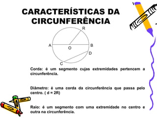 O documento explica as características de círculos e circunferências, incluindo que uma circunferência é uma linha em forma de círculo enquanto um círculo é uma superfície plana. Ele também define termos como raio, diâmetro e corda e fornece fórmulas para calcular o perímetro, área, comprimento de arcos e áreas de setores circulares. Exemplos ilustram como aplicar essas fórmulas para cálculos.
