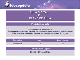 Este documento apresenta um plano de aula sobre círculos e circunferências para alunos do 8o ano. A aula inclui 15 atividades que abordam conceitos como raio, diâmetro, corda e centro, bem como exemplos práticos envolvendo rodas, anéis de Saturno e jogos olímpicos. O objetivo é que os alunos reconheçam esses elementos e saibam identificá-los.