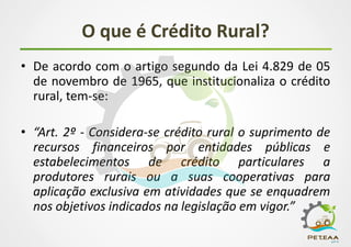 O crédito rural é um suprimento de recursos financeiros destinado a produtores rurais e suas cooperativas, regulado pela lei 4.829 de 1965, com o objetivo de estimular investimentos e melhorar a produção. Existem três modalidades de crédito rural: corrente, educativo e especial, e ele é classificado em crédito de custeio, investimento e comercialização. Beneficiários incluem produtores rurais e cooperativas, e a concessão requer idoneidade e apresentação de planos, com limites de financiamento estabelecidos pelo sistema nacional.
