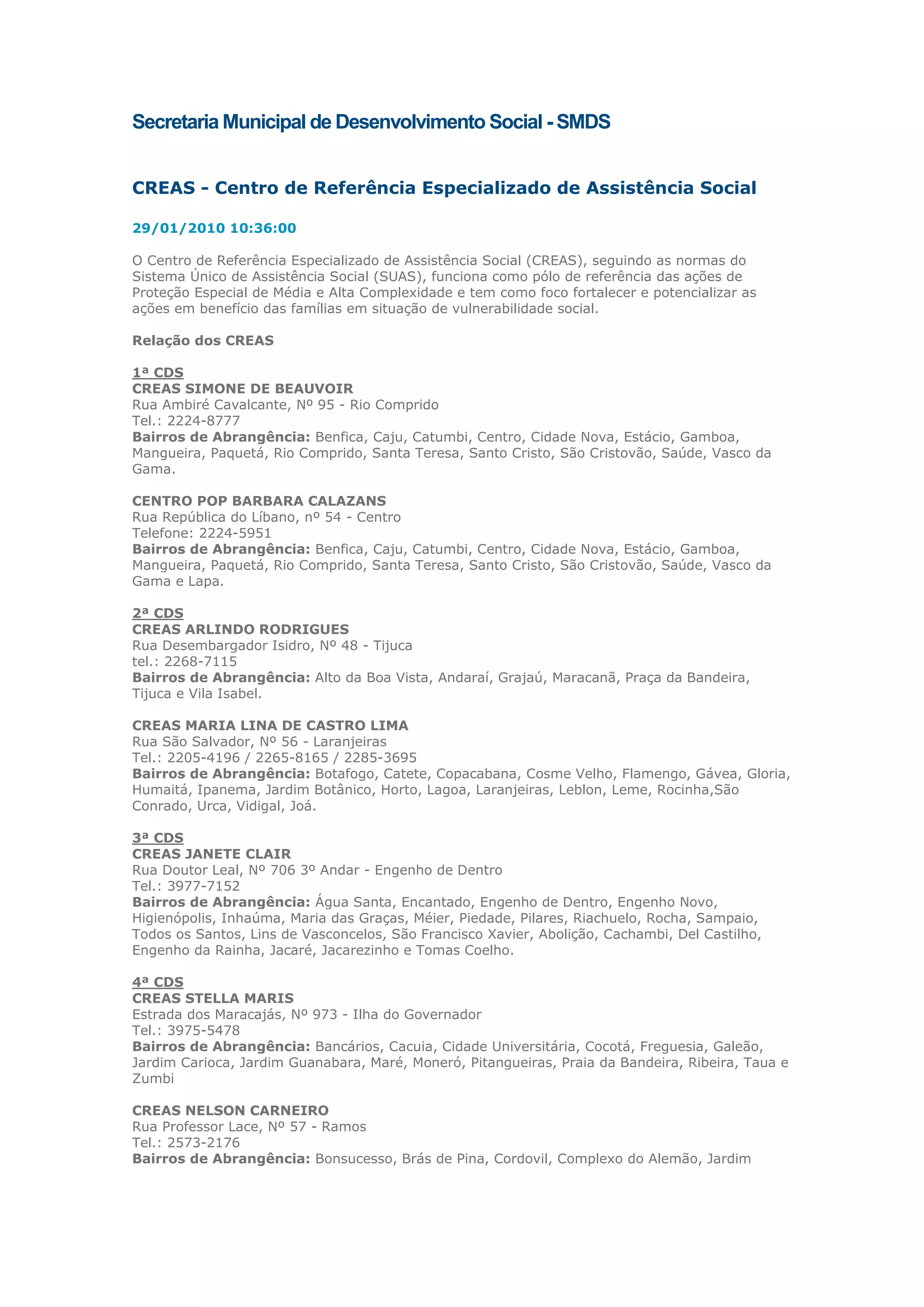 O documento lista os Centros de Referência Especializados de Assistência Social (CREAS) no município do Rio de Janeiro, incluindo endereços e áreas de abrangência. Também descreve brevemente os serviços oferecidos pelos CREAS e Centros Populares, como apoio a famílias vulneráveis e população em situação de rua.