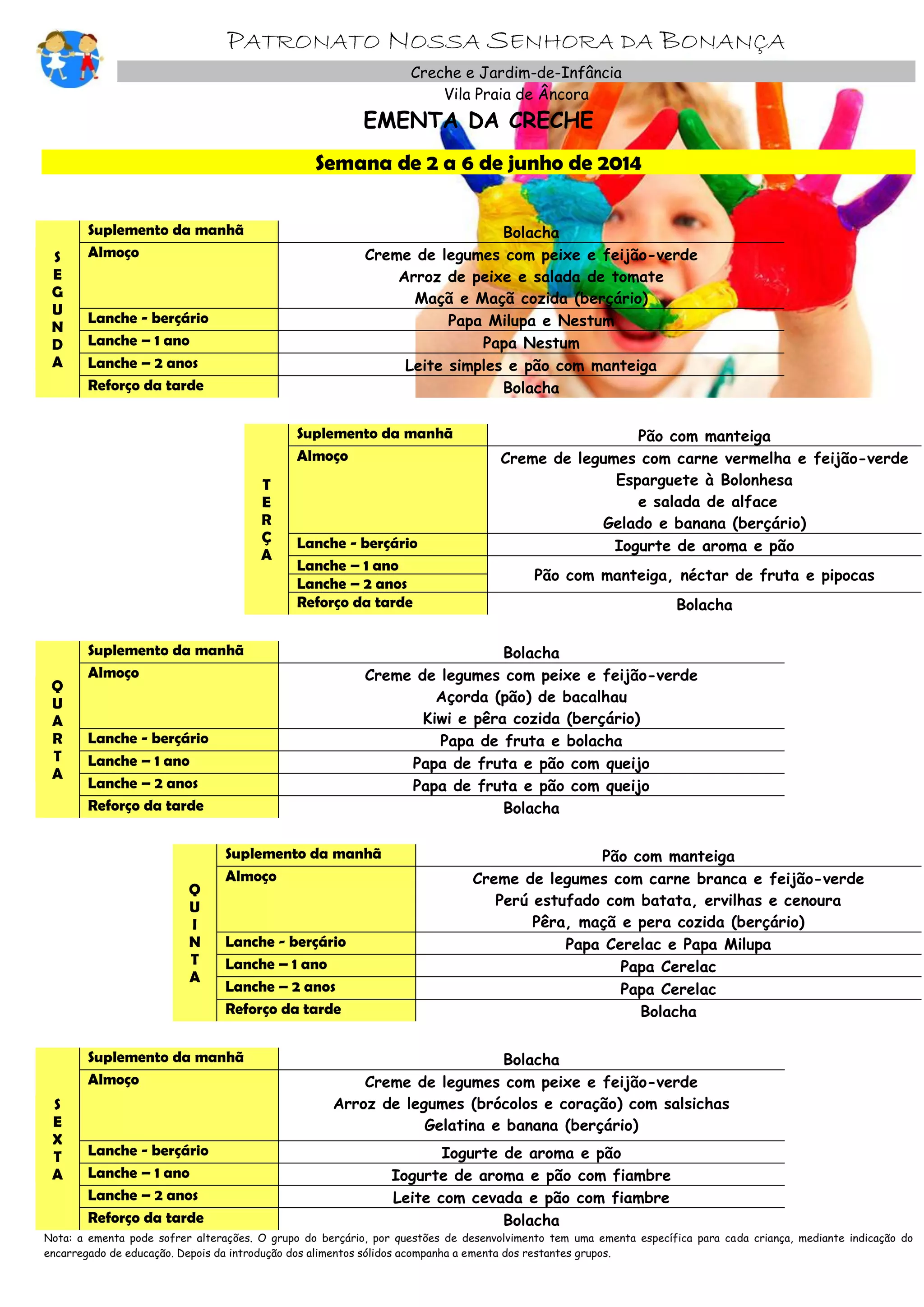 Este documento apresenta as ementas semanais da creche Patronato Nossa Senhora da Bonança em Vila Praia de Âncora, incluindo refeições, lanches e suplementos para as crianças dos grupos de berçário, 1 ano e 2 anos. As ementas incluem pratos como creme de legumes com peixe ou carne, arroz de peixe, massa e saladas. As refeições variam diariamente ao longo da semana.