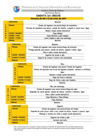 Este documento apresenta as ementas semanais da creche Patronato Nossa Senhora da Bonança para as semanas de 01 a 26 de maio de 2017. As ementas incluem os almoços, lanches e suplementos para cada dia da semana, variando entre cremes de legumes, sopas, carnes, peixes e acompanhamentos. As ementas do berçário são específicas para cada criança.