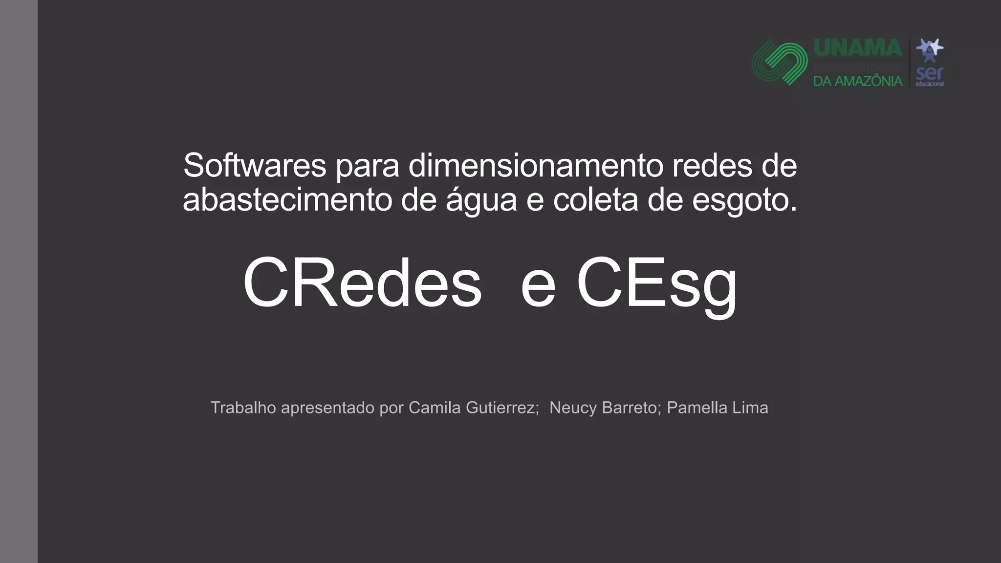 O documento descreve softwares para projetar redes de abastecimento de água e esgoto. Apresenta o CRedes e o CEsg, incluindo suas funcionalidades, como recebem dados de entrada, realizam cálculos hidráulicos e fornecem resultados. Também aplica os softwares em um projeto de rede de água potável e discute suas vantagens para auxiliar estudantes de engenharia.
