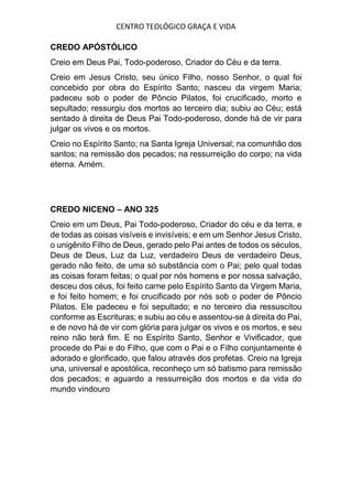 O documento apresenta os principais credos históricos da Igreja Cristã: o Credo Apostólico, o Credo Niceno de 325, o Credo Niceno-Constantinopolitano de 381 e o Credo Calcedônico de 451. Cada credo afirma as principais doutrinas cristãs como a Trindade, a encarnação, morte e ressurreição de Jesus Cristo e sua volta gloriosa.