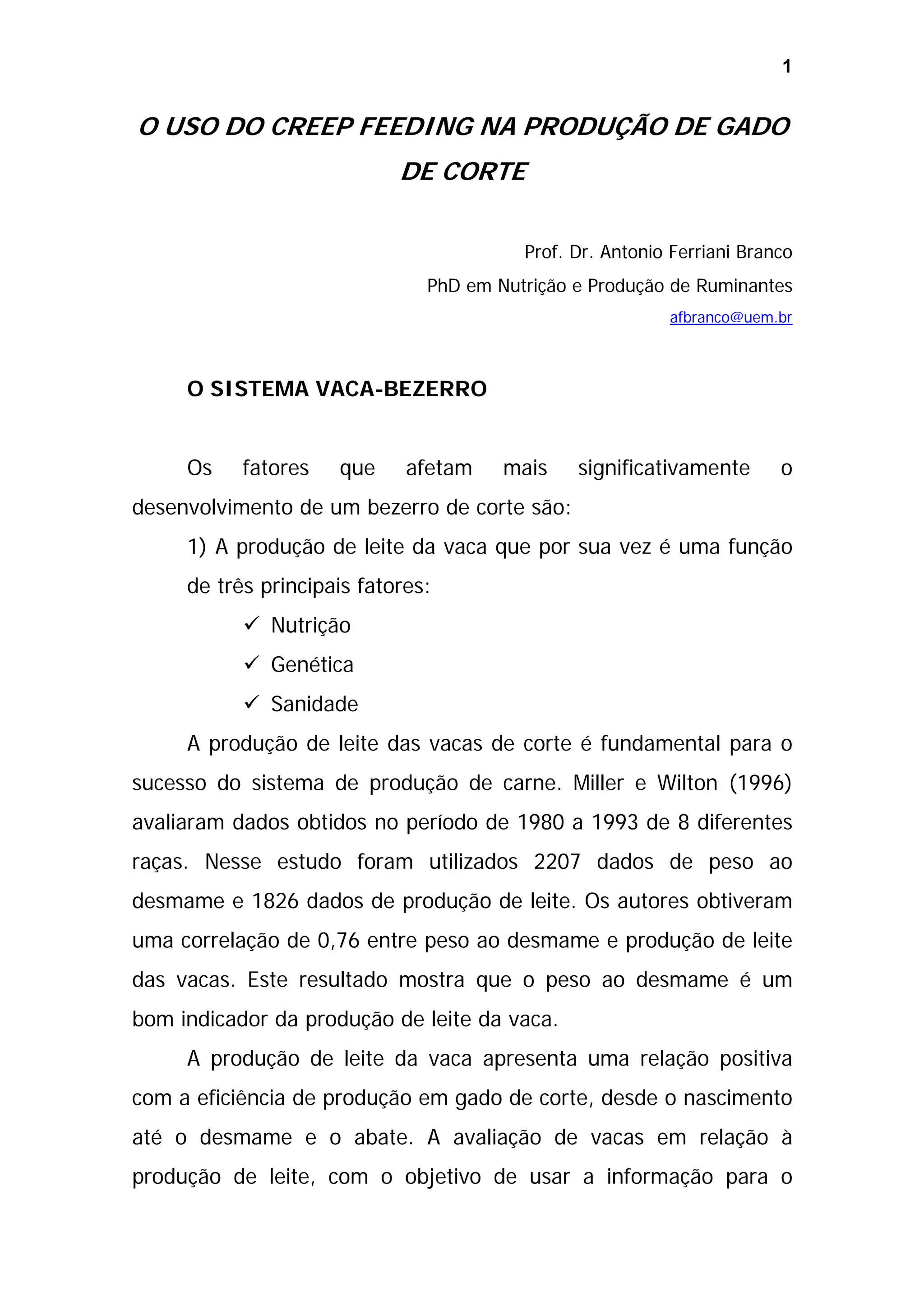 O documento discute o uso da técnica de creep feeding para suplementar bezerros ainda durante o período de amamentação. O creep feeding tem como objetivos principais aumentar a taxa de ganho de peso dos bezerros, produzir lotes mais uniformes e melhorar a condição das vacas. Fatores como a produção de leite da vaca, as exigências nutricionais dos bezerros e a qualidade da pastagem devem ser considerados para o sucesso da prática.