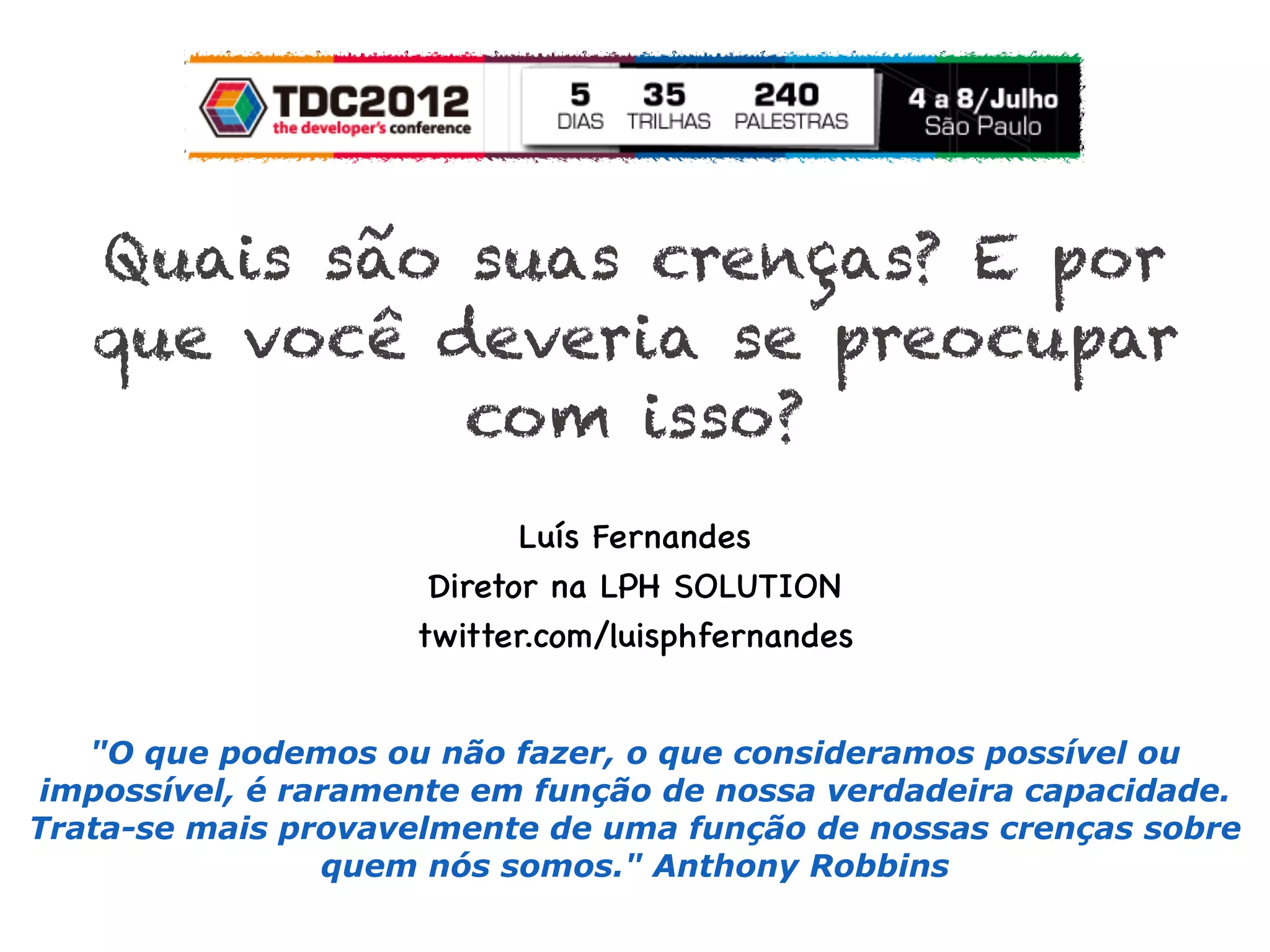 O documento explora a importância das crenças na determinação do que consideramos possível ou impossível, citando diversas personalidades que enfatizam a força do pensamento e a superação de limitações. Destaca que o sucesso está ligado à ação e ao treinamento, além de instigar reflexões sobre crenças que fortalecem ou limitam o potencial pessoal. Finaliza convocando o leitor a agir com convicção e a redefinir suas crenças para alcançar seus objetivos.