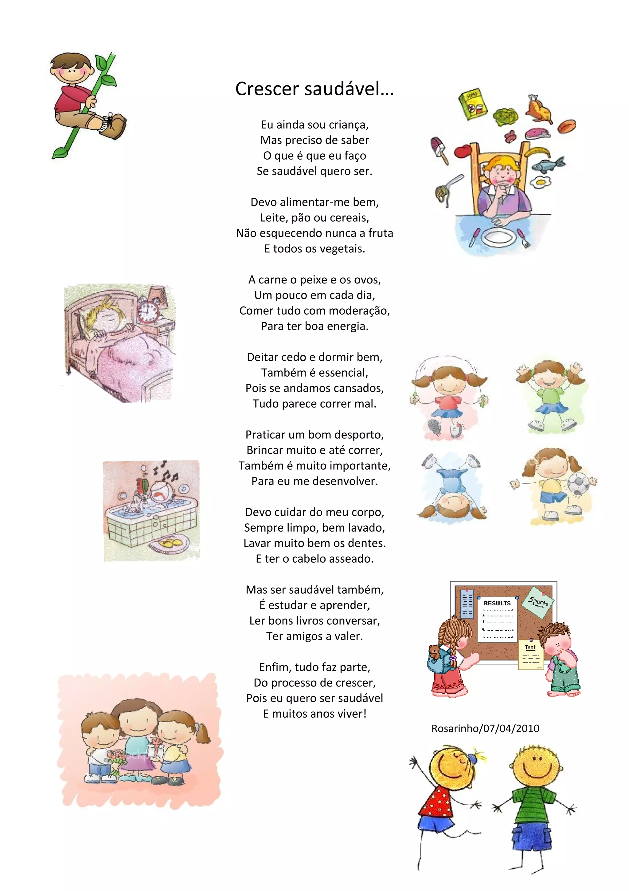 O poema fornece conselhos para crianças crescerem de forma saudável, enfatizando a importância de uma alimentação balanceada, exercício, higiene pessoal, aprendizado e relacionamentos sociais positivos.
