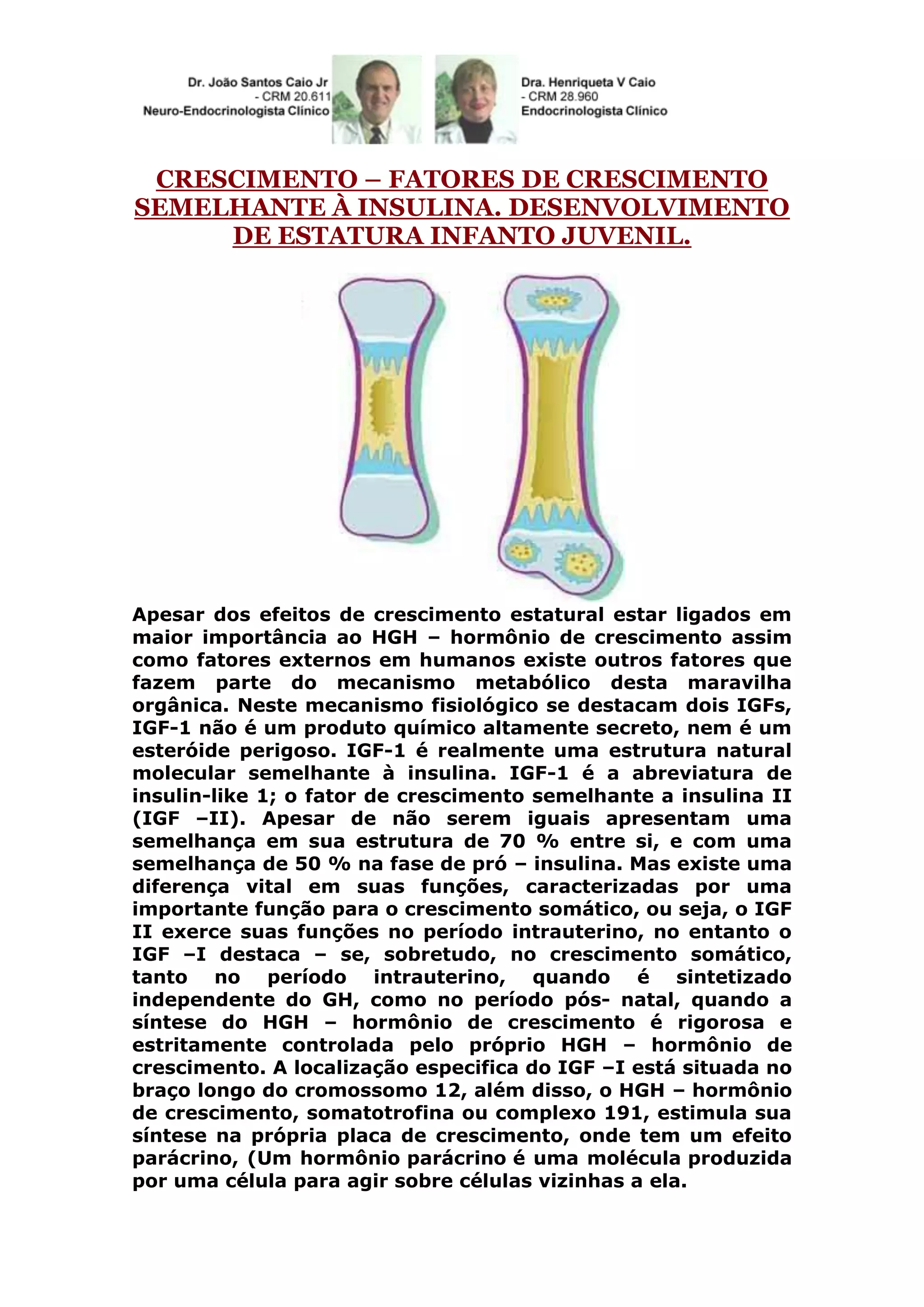 O documento discute o papel do IGF-1 e IGF-2 no crescimento humano, destacando a importância do hormônio de crescimento (HGH) e a interação entre estes fatores em diferentes períodos da vida. O IGF-1 é enfatizado por sua função no crescimento pós-natal e sua regulação pela síntese do HGH, enquanto o IGF-2 atua principalmente no intrauterino. A pesquisa também menciona a síntese e circulação do IGF-1, que é aumentada através de um complexo formado por proteínas carreadoras.