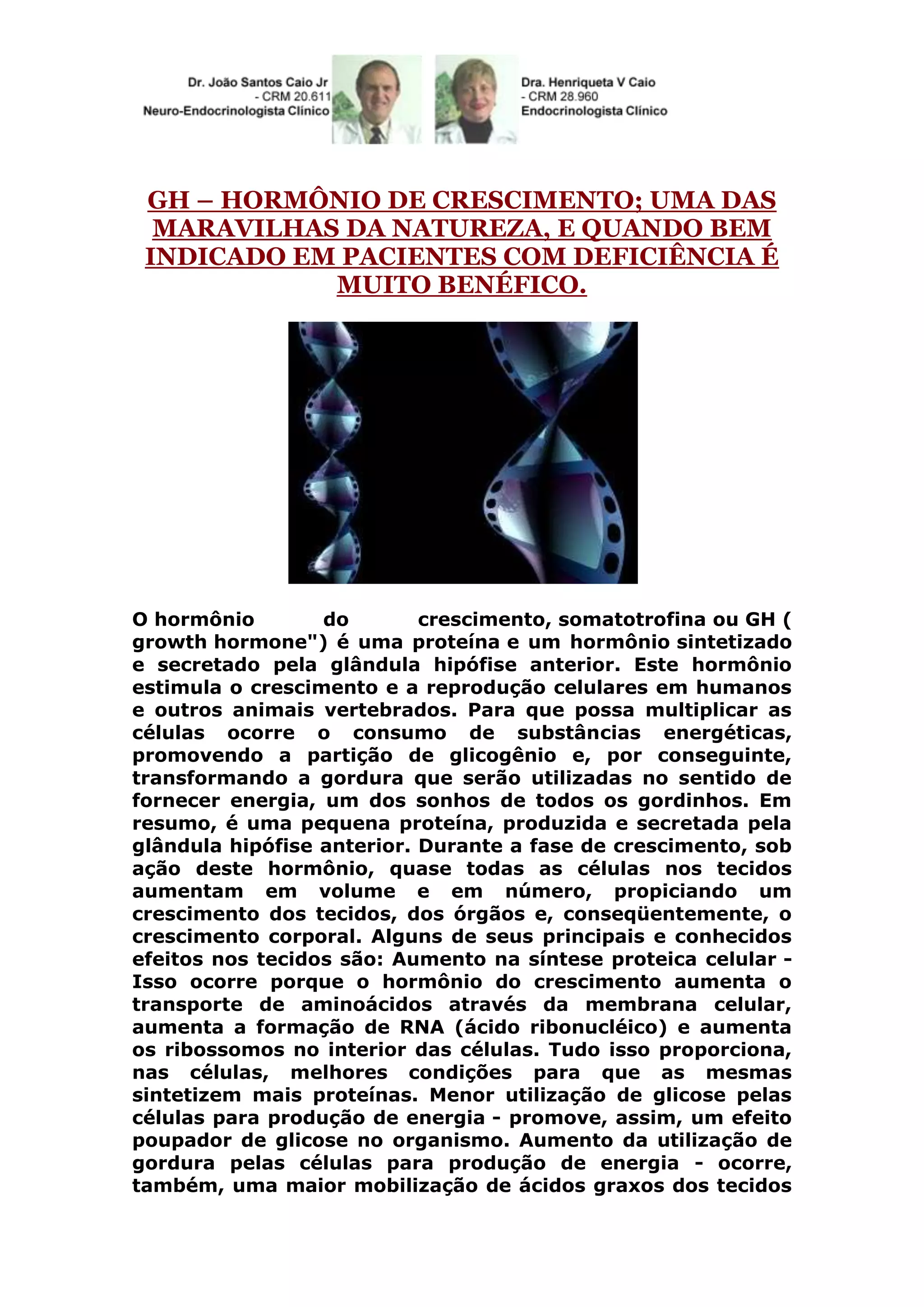 O hormônio de crescimento (GH) é produzido pela glândula hipófise anterior e tem um papel crucial no crescimento e desenvolvimento celular em humanos e vertebrados. Ele aumenta a síntese proteica, reduz o uso de glicose e promove a queima de gorduras, resultando no aumento de tecidos e órgãos. A liberação do GH é controlada por fatores hipotalâmicos e ocorre de forma esporádica, com picos ao longo do dia.