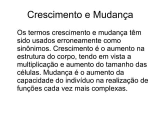 O documento descreve as diferentes etapas do crescimento e desenvolvimento humano, incluindo o período fetal, a infância, a adolescência e a maturidade. Ele explica como o corpo muda fisicamente em cada estágio através do aumento de tamanho e capacidade funcional, culminando na capacidade de se reproduzir e criar os próprios filhos.