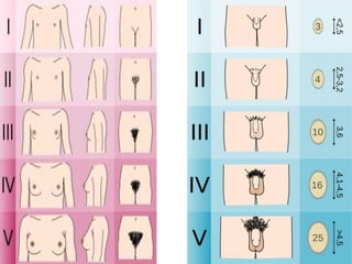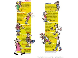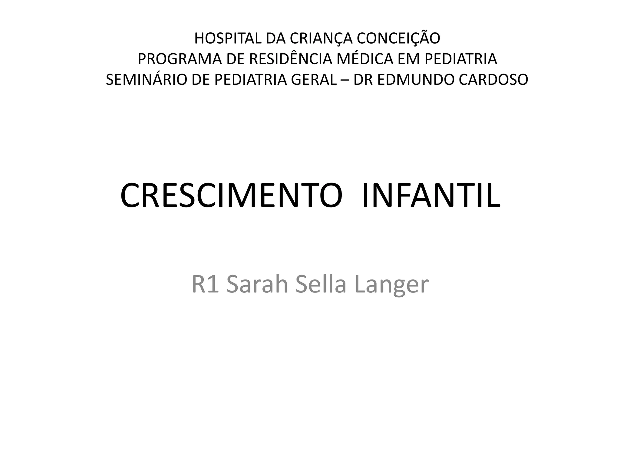 O documento discute as diferentes fases do crescimento infantil, desde o crescimento intra-uterino até a adolescência. Ele descreve os marcos de desenvolvimento típicos de cada período, incluindo ganhos de peso e altura esperados, aquisição de habilidades motoras e mudanças fisiológicas. O documento também discute fatores que podem influenciar o crescimento em cada fase.