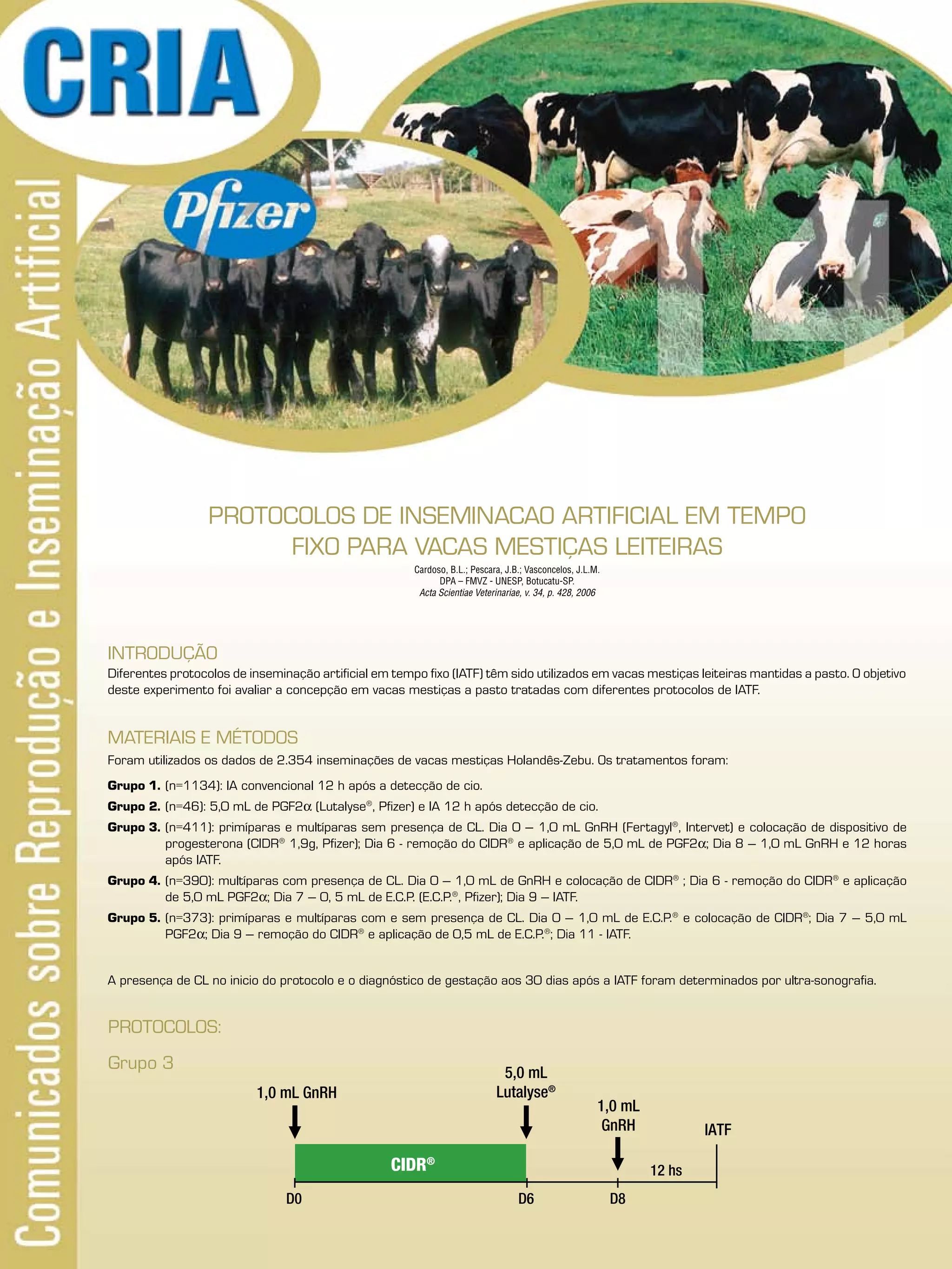 Este documento avalia diferentes protocolos de inseminação artificial em tempo fixo (IATF) em vacas mestiças leiteiras mantidas a pasto. Os animais foram divididos em 5 grupos e tratados com diferentes combinações de GnRH, PGF2α, dispositivos de progesterona e inseminação. O protocolo do Grupo 5, que usou ECP e CIDR, apresentou a melhor taxa de concepção de 35,7% em relação ao grupo controle.