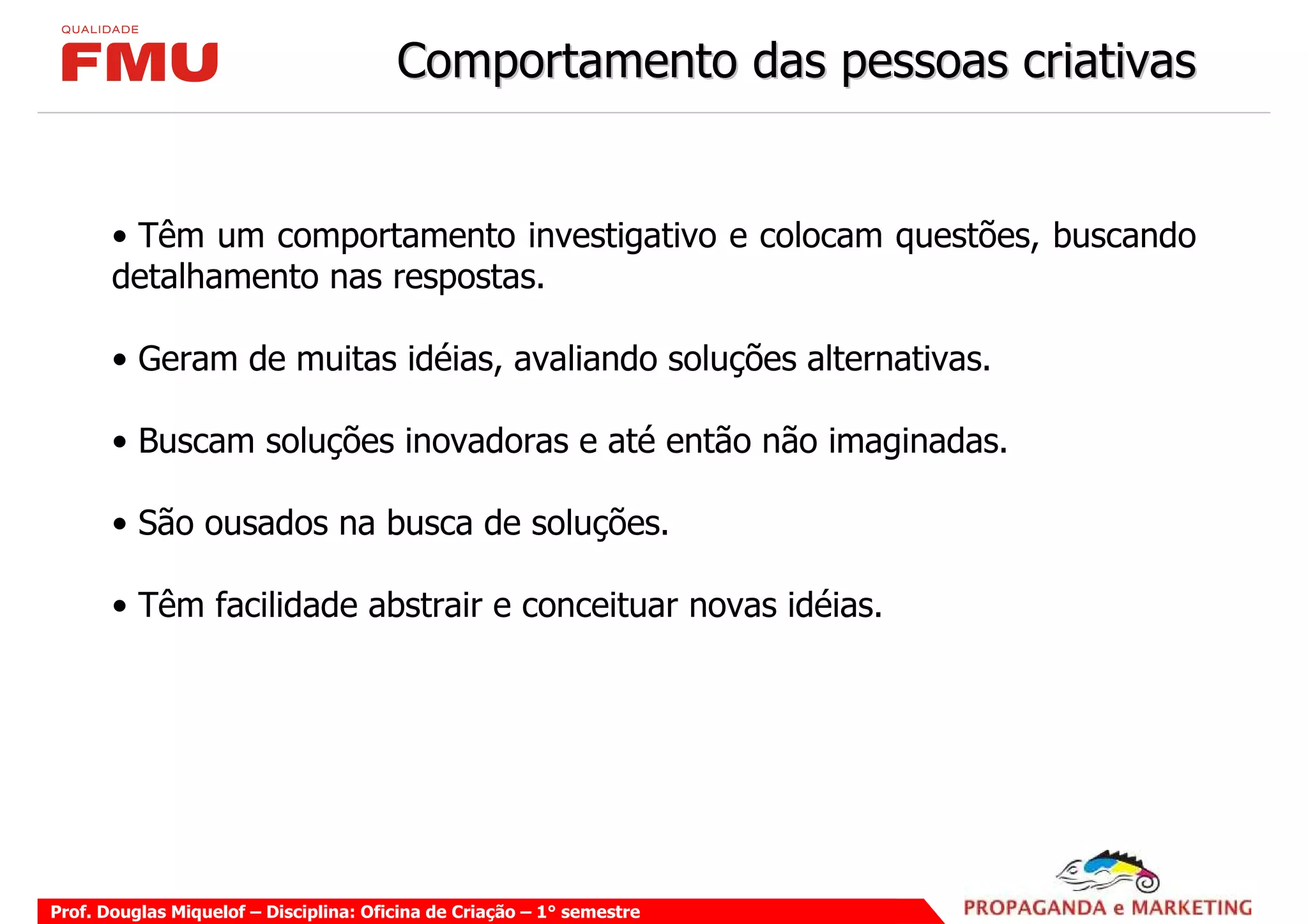 O documento descreve características e habilidades de pessoas criativas, como curiosidade, persistência e capacidade de gerar muitas ideias. Também apresenta bloqueios à criatividade como medo de errar e pressão por conformidade, além de técnicas para estimular o pensamento criativo, como brainstorming e análise de problemas.