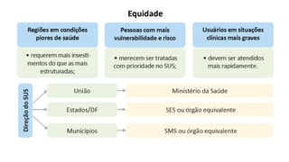 O sistema de saúde brasileiro (SUS) evoluiu para entender saúde como um conceito que abrange não apenas a ausência de doenças, mas também o acesso a bens e serviços fundamentais como educação e habitação. Ele enfatiza a equidade e a integralidade no atendimento, garantindo que os cuidados sejam proporcionados de acordo com as necessidades de cada indivíduo. A organização dos serviços de saúde é hierarquizada, desde a atenção básica até os atendimentos de alta complexidade, buscando atender o cidadão de forma integral.