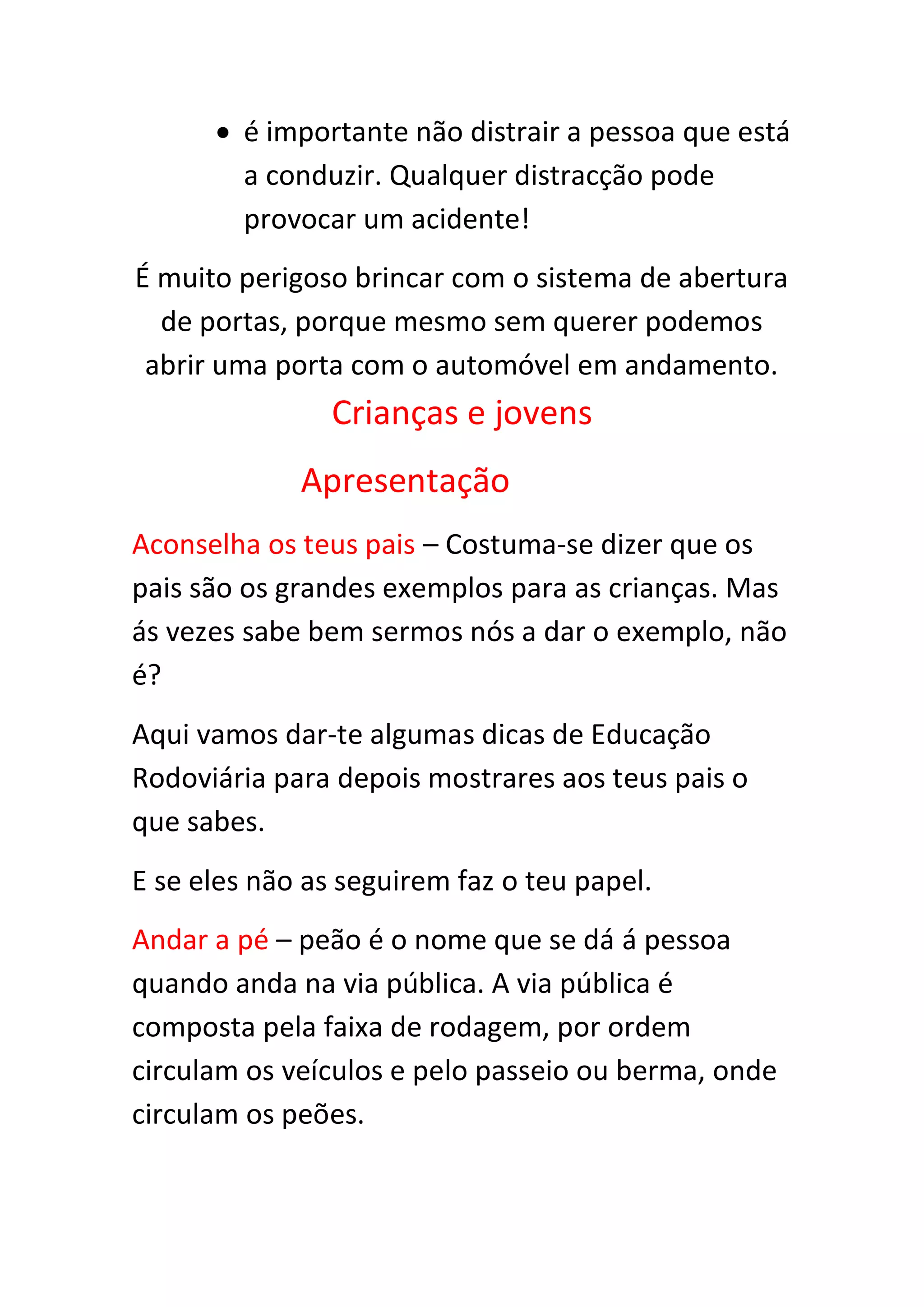 Este documento fornece dicas de segurança rodoviária para crianças ensinarem aos seus pais, como usar corretamente o cinto de segurança, não distrair o motorista, e permanecer seguro dentro do veículo.