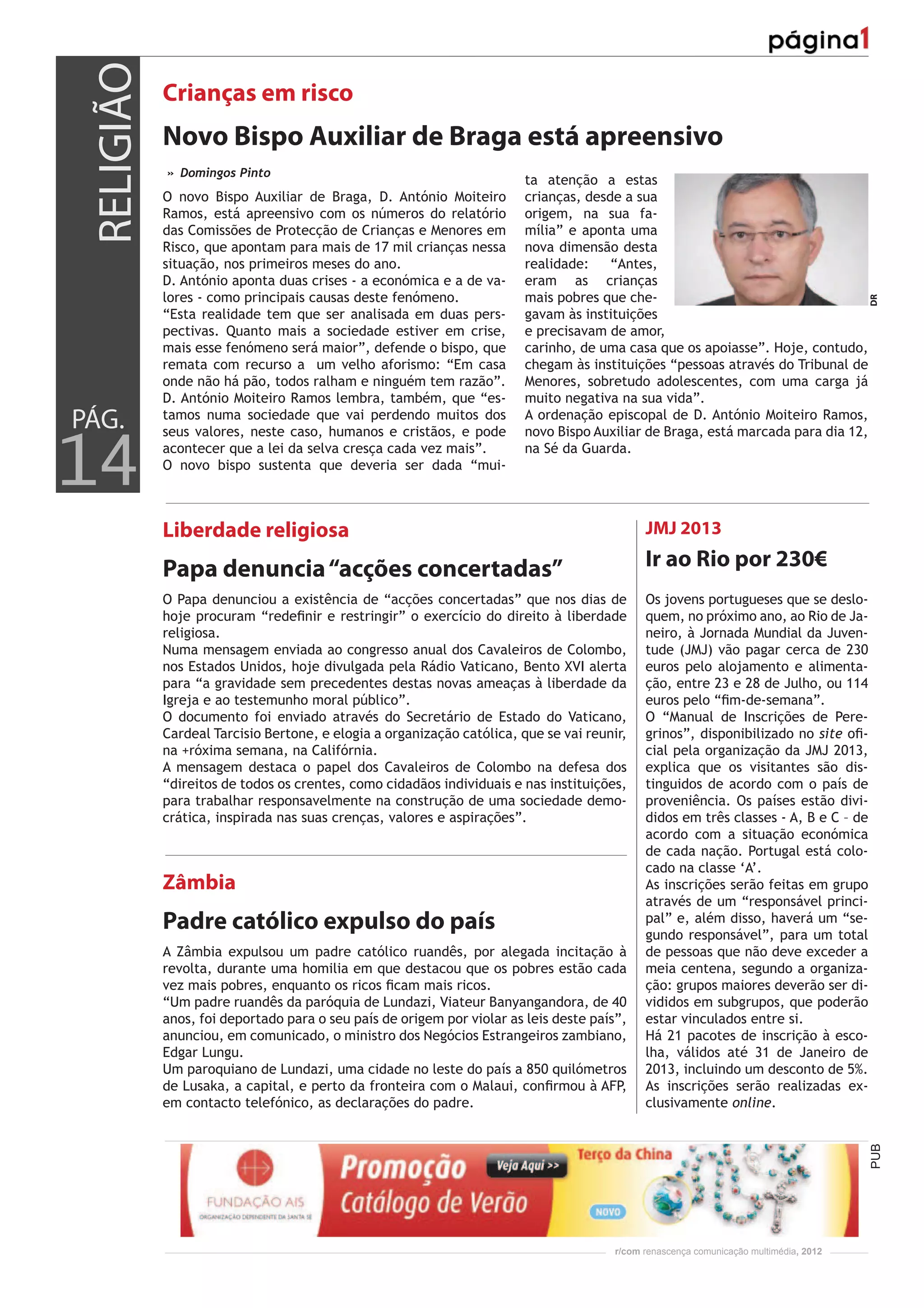 1) O novo Bispo Auxiliar de Braga está preocupado com o número de crianças em risco em Portugal, que ultrapassou 17 mil nos primeiros meses do ano.