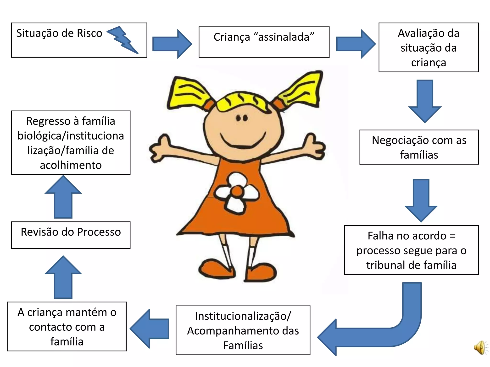 Uma criança foi considerada em risco e avaliada. Foram negociadas opções com a família biológica e famílias de acolhimento, incluindo o regresso à família biológica ou institucionalização. Se não houver acordo, o processo segue para o tribunal de família.