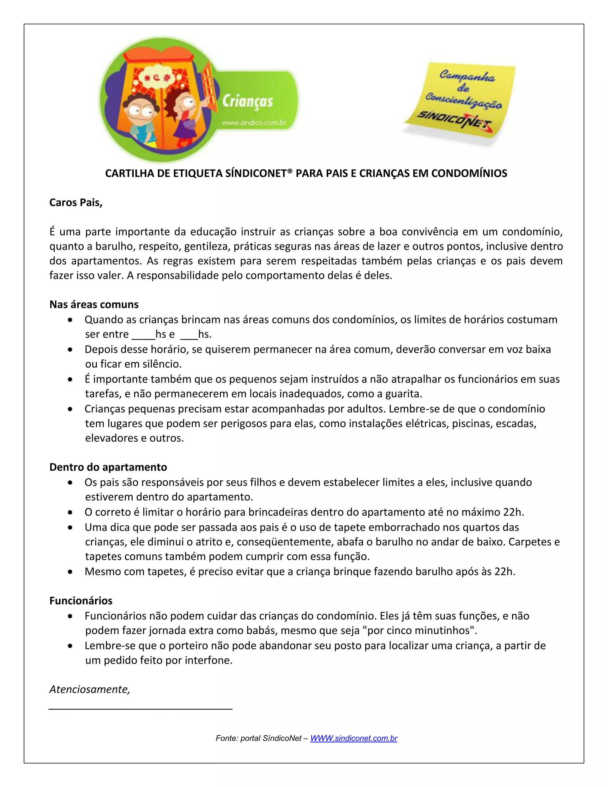 A cartilha ensina pais e crianças sobre etiqueta em condomínios, incluindo limitar barulho e respeitar funcionários. Crianças podem brincar nas áreas comuns entre certas horas e devem ficar em silêncio depois. Dentro de apartamentos, pais devem limitar barulho após 22h e usar tapetes para abafar som. Funcionários não podem cuidar de crianças.