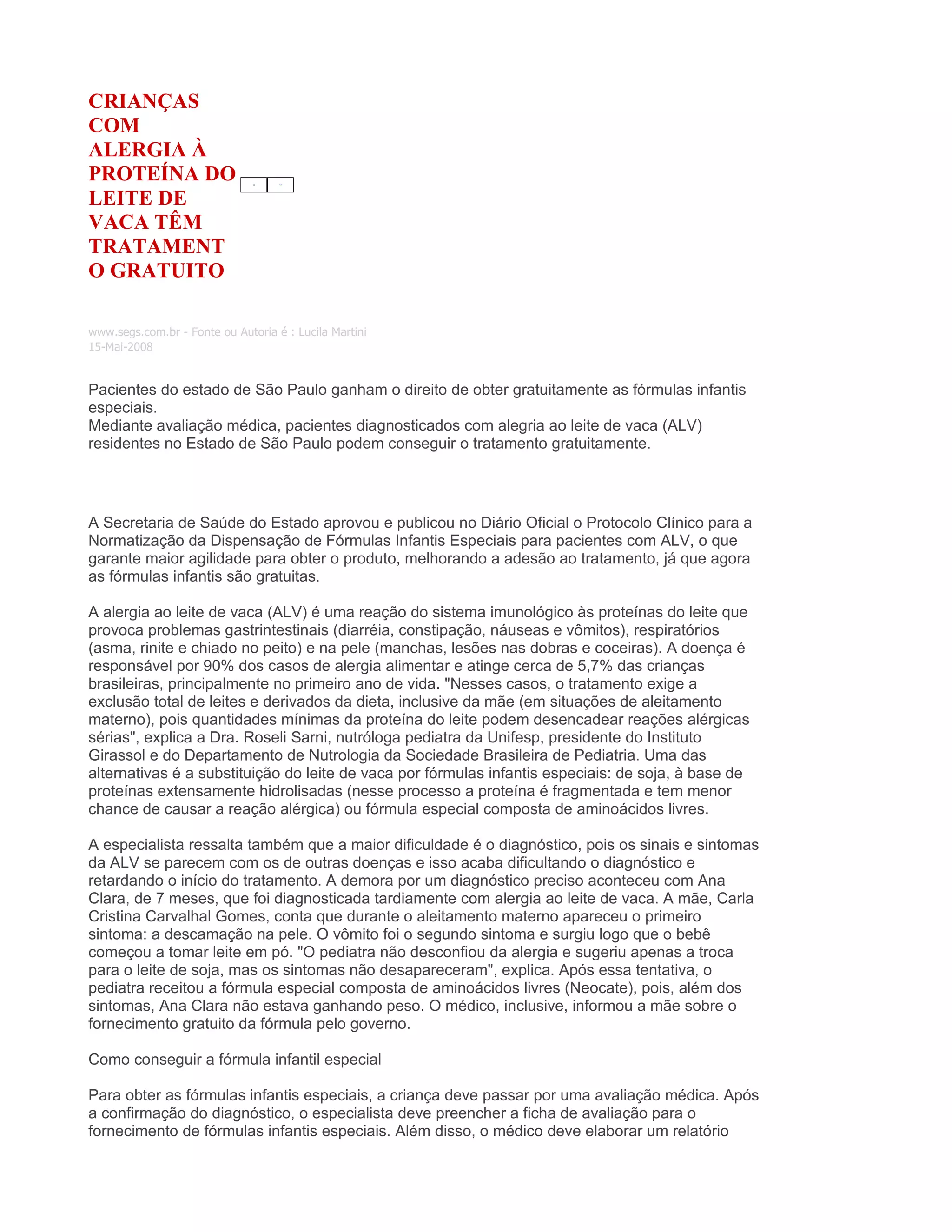 O documento descreve o tratamento gratuito para crianças com alergia ao leite de vaca no estado de São Paulo. Pacientes diagnosticados com a condição podem obter fórmulas infantis especiais sem custo mediante avaliação médica. O protocolo clínico aprovado garante maior agilidade no fornecimento dos produtos, melhorando a adesão ao tratamento.