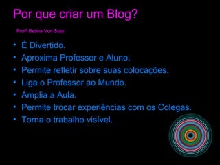 Este documento discute os benefícios de criar um blog educacional, incluindo aproximar professores e alunos e permitir a troca de experiências. Ele fornece exemplos de blogs e instruções passo-a-passo para criar um novo blog no Blogger, incluindo criar uma conta no Gmail, escolher um nome e modelo para o blog.