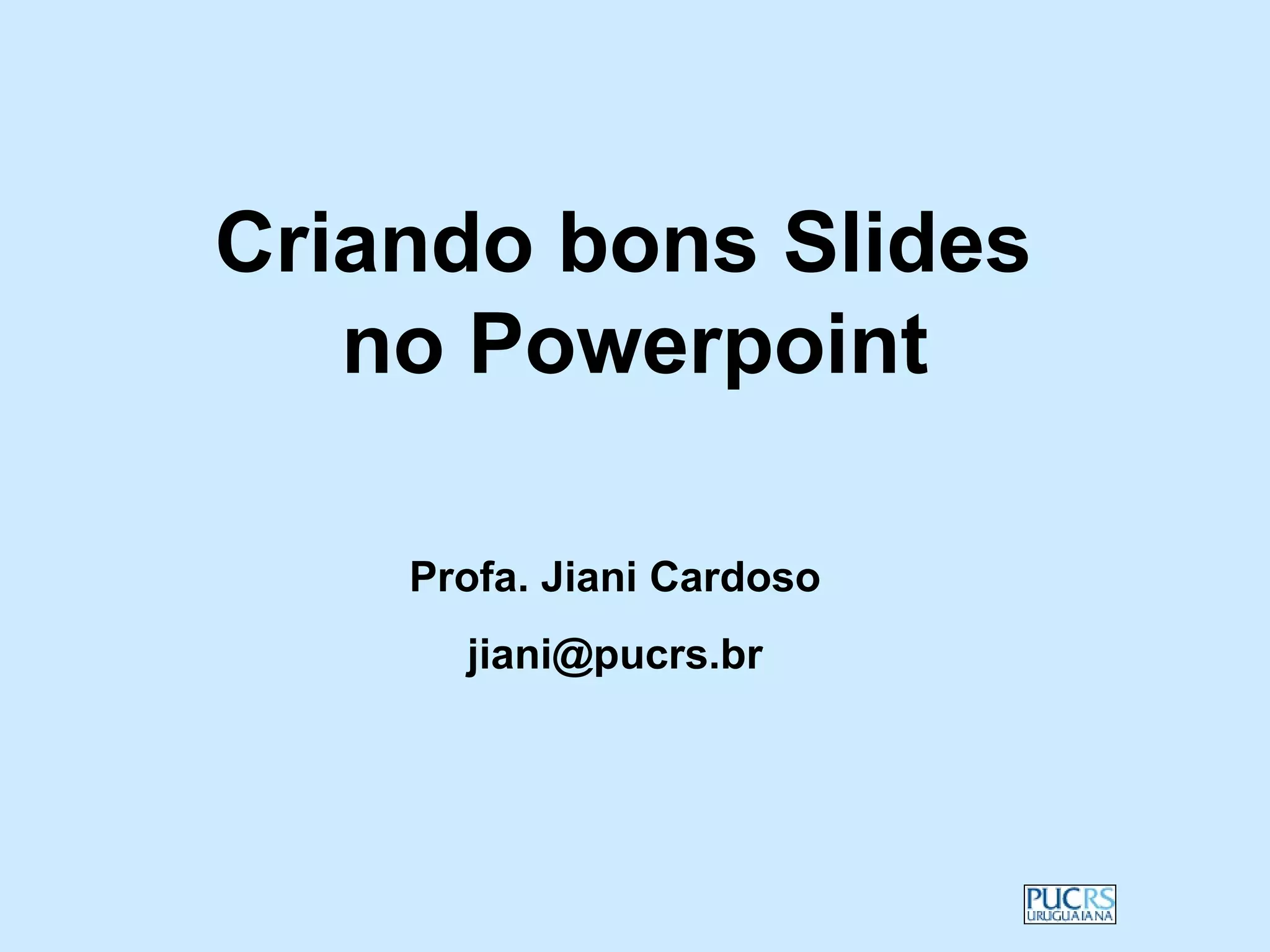 O documento fornece dicas para criar bons slides no PowerPoint, abordando estrutura, elementos visuais, uso de gráficos e correção ortográfica. É destacada a importância de usar poucas palavras e frases de impacto por slide, além de cores, fontes e fundos que não distraiam o público.