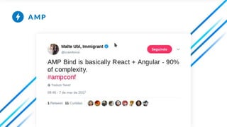 O documento descreve como criar componentes interativos em páginas AMP usando a tag <amp-bind>. A tag <amp-bind> permite criar estado mutável e vinculá-lo a elementos da página através de expressões, permitindo interações complexas sem usar JavaScript customizado. O estado é definido usando <amp-state> e pode ser atualizado com AMP.setState ou AMP.pushState.