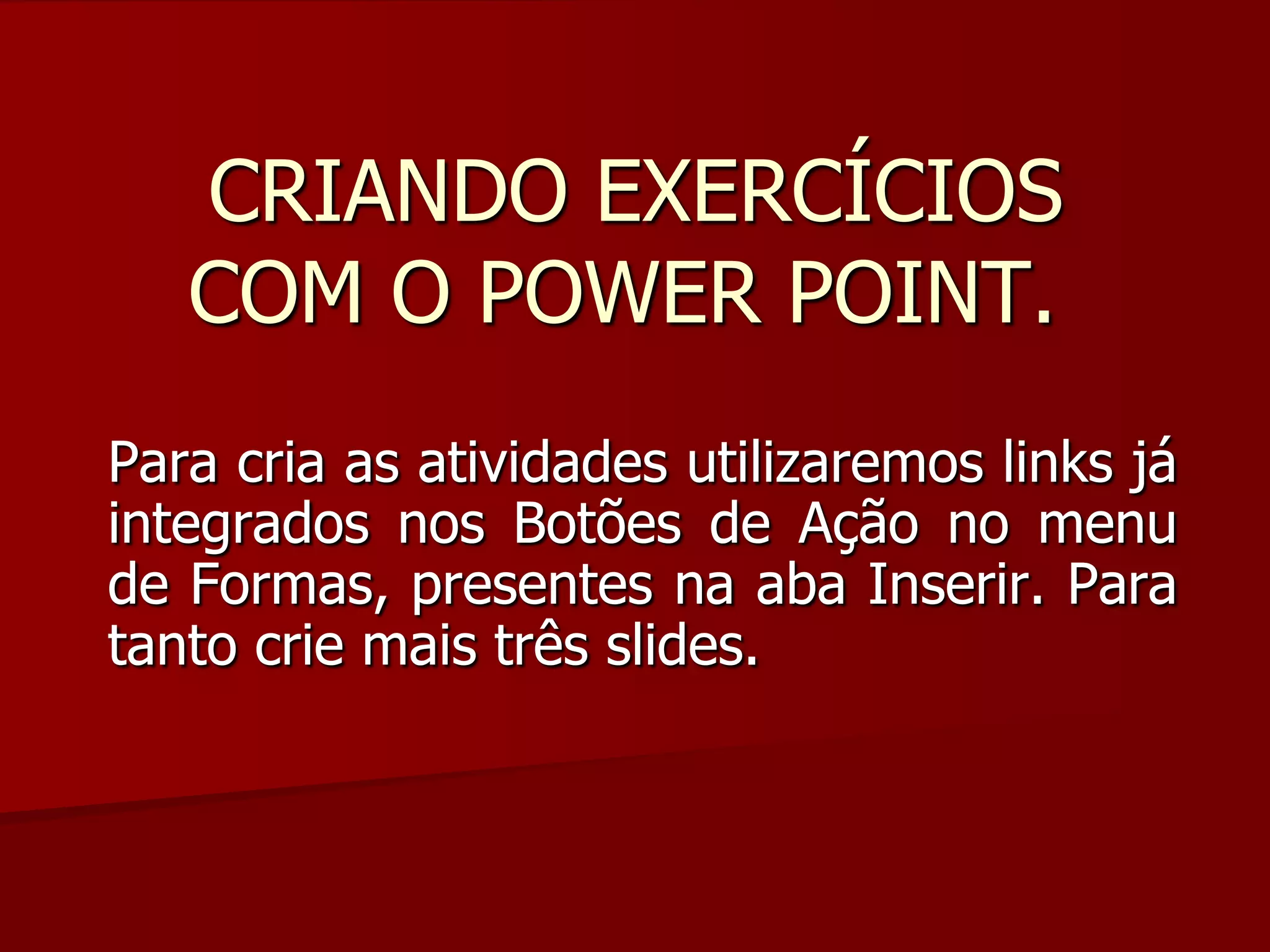 O documento descreve como criar exercícios no PowerPoint usando botões de ação para inserir opções de resposta em slides adicionais, com a primeira pergunta sendo "Quanto é 4+5?" e as opções de resposta sendo 7, 8, 9 e 6.