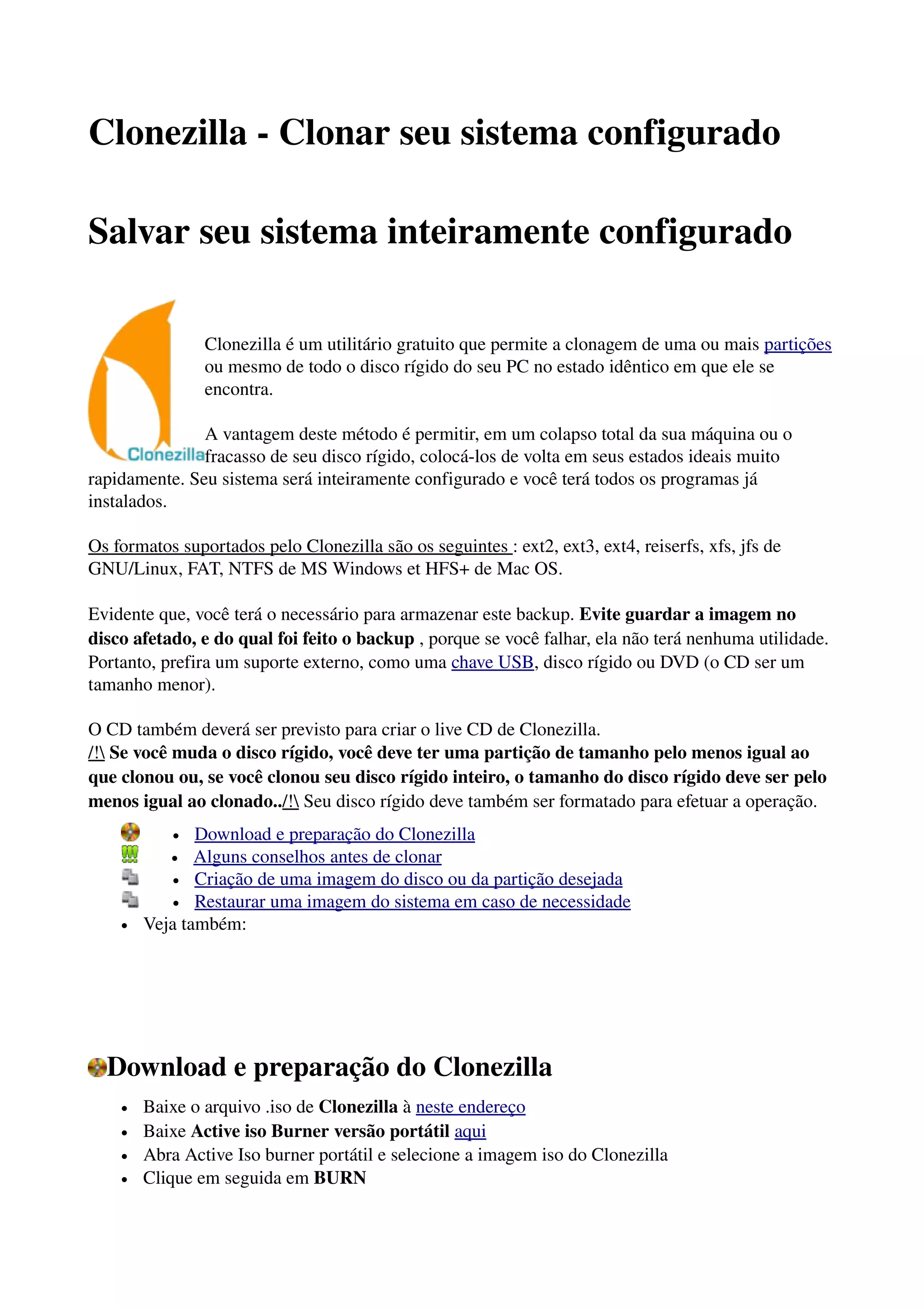 Clonezilla permite clonar partições ou discos rígidos inteiros para criar imagens de backup. Essas imagens podem ser usadas para restaurar rapidamente o sistema em caso de falha, mantendo toda a configuração e programas instalados. O documento explica como baixar e usar o Clonezilla para criar e restaurar imagens de backup.
