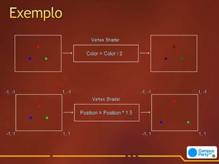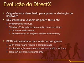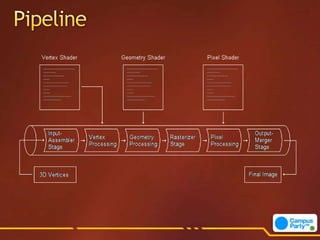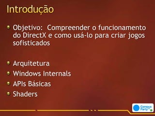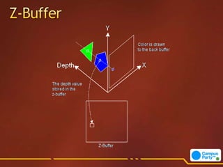 A palestra aborda evolução de GPUs, renderização em servidores e técnicas de desenvolvimento em C/C++ para jogos em 3D. O palestrante José Antonio Leal de Farias apresenta vários demos para ilustrar os tópicos e conceitos discutidos.