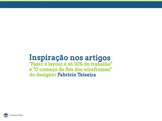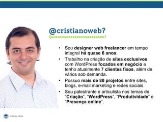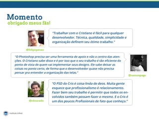 O documento apresenta as experiências e competências de um designer web freelancer com quase 6 anos de atuação, incluindo a criação de layouts em PSD para front-end e back-end. Ele fornece dicas práticas para organização e documentação de projetos, além de recomendações de ferramentas e a importância da colaboração entre diferentes funções no processo de criação de sites. O autor enfatiza a necessidade de uma abordagem holística no design, evitando o 'tecniquês' ao explicar funcionalidades.