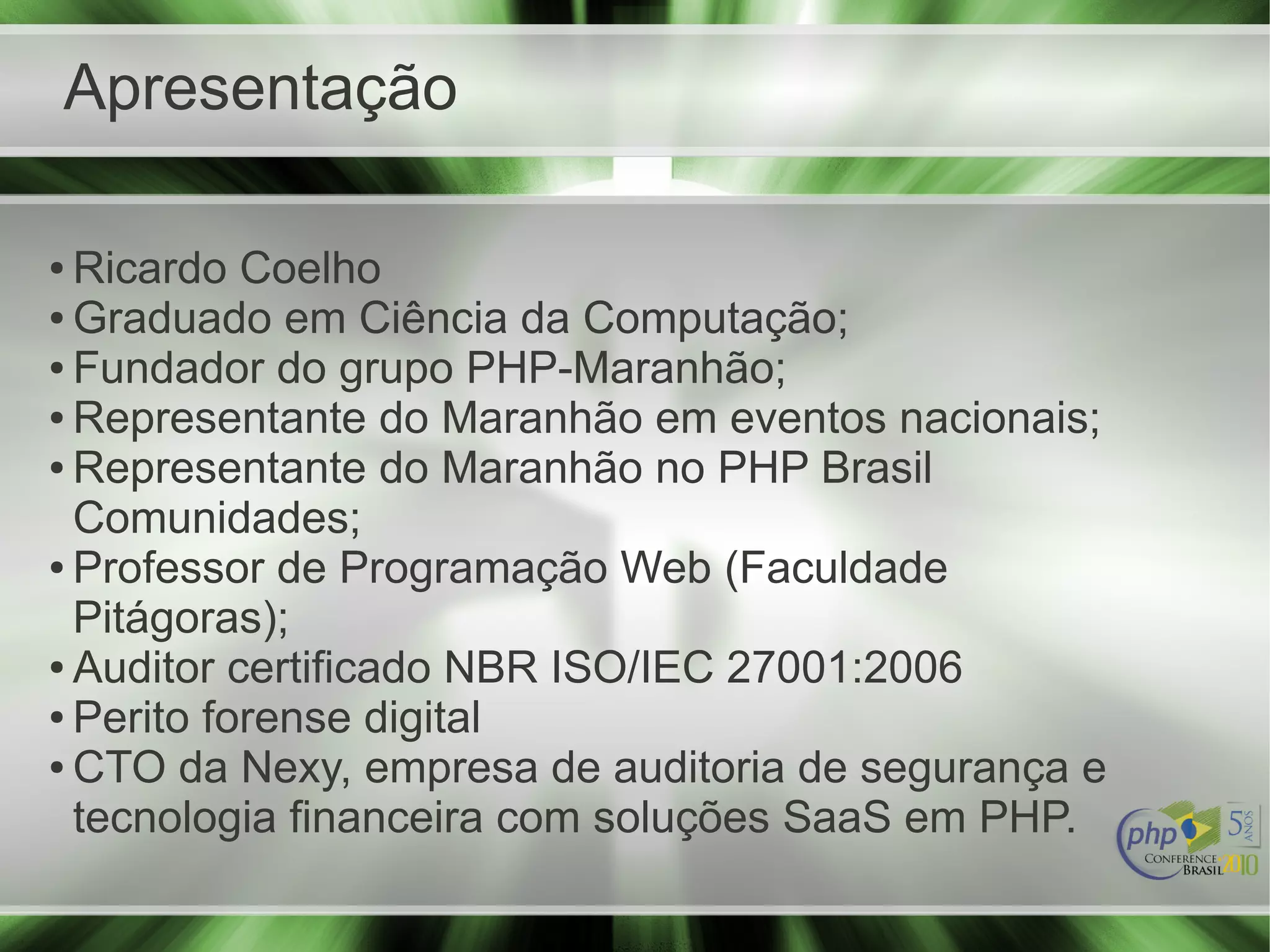 Este documento apresenta Ricardo Coelho e discute a criação de plugins jQuery. Ele explica o que é jQuery, por que criar plugins, como criar plugins básicos preservando o encadeamento, e dá um exemplo de plugin de efeito. O documento também lista referências úteis sobre plugins jQuery.
