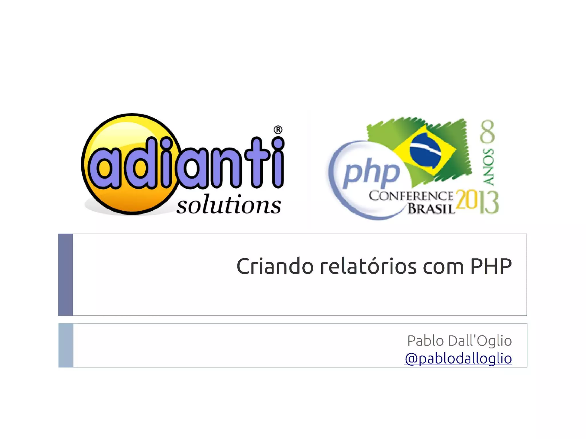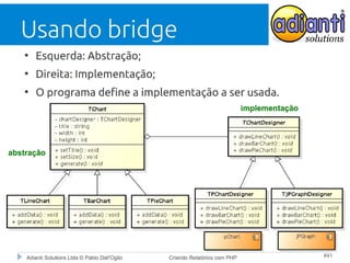 Este documento discute a criação de relatórios com PHP. Ele apresenta várias bibliotecas para geração de relatórios em formatos como XLS, PDF e RTF, e bibliotecas para gráficos como JPGraph e pChart. Também discute a importância do desacoplamento entre o código da aplicação e as bibliotecas externas para facilitar a manutenção e evolução do código.