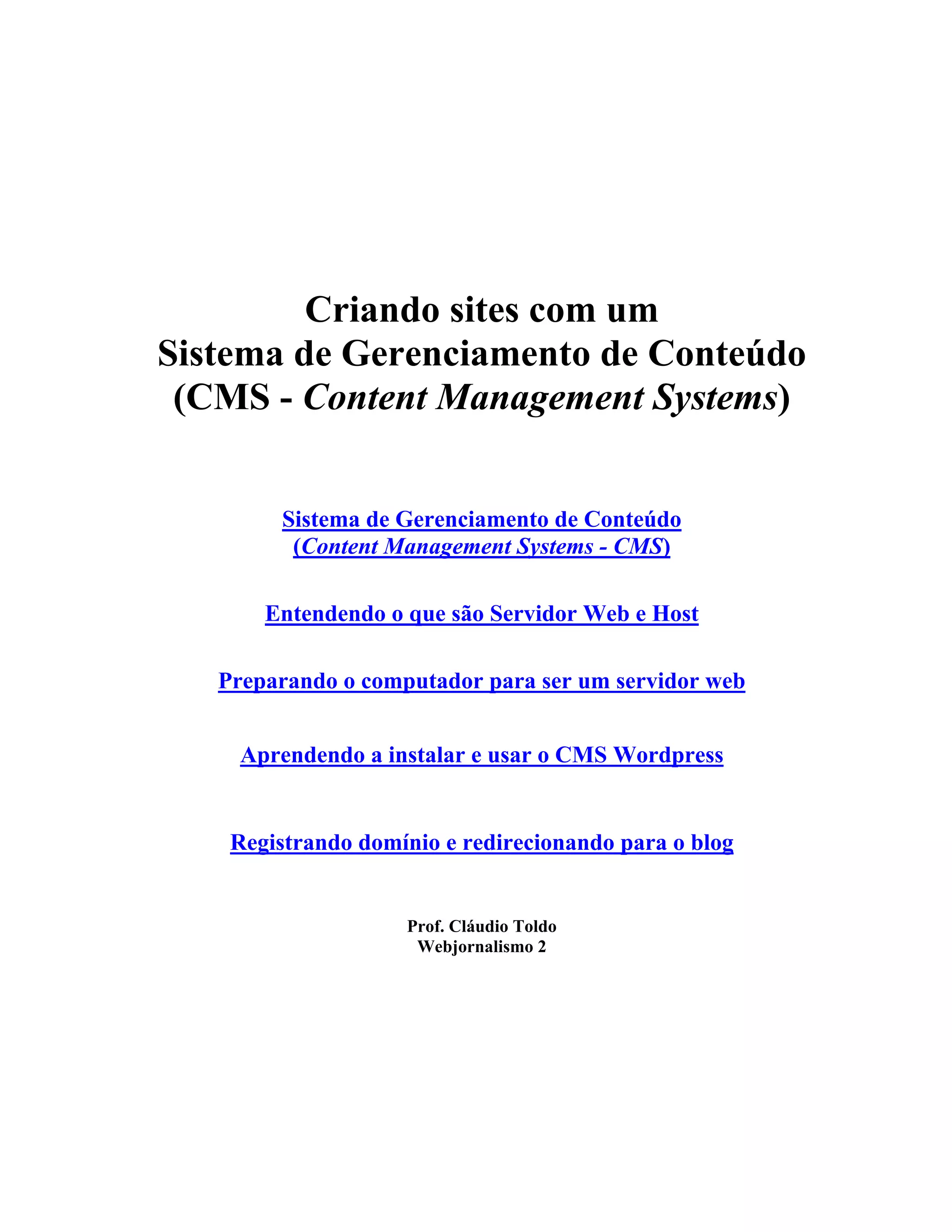 1. O documento discute a criação de sites usando sistemas de gerenciamento de conteúdo (CMS), introduzindo CMS populares como Wordpress, Joomla e Drupal.