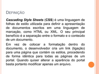 O documento descreve como usar CSS (Cascading Style Sheets) para criar estilos para sites. CSS permite separar o conteúdo da formatação, tornando mais fácil manter e atualizar a aparência de um site. Exemplos de código CSS demonstram como definir estilos para elementos como fontes, cores, layouts e navegação.