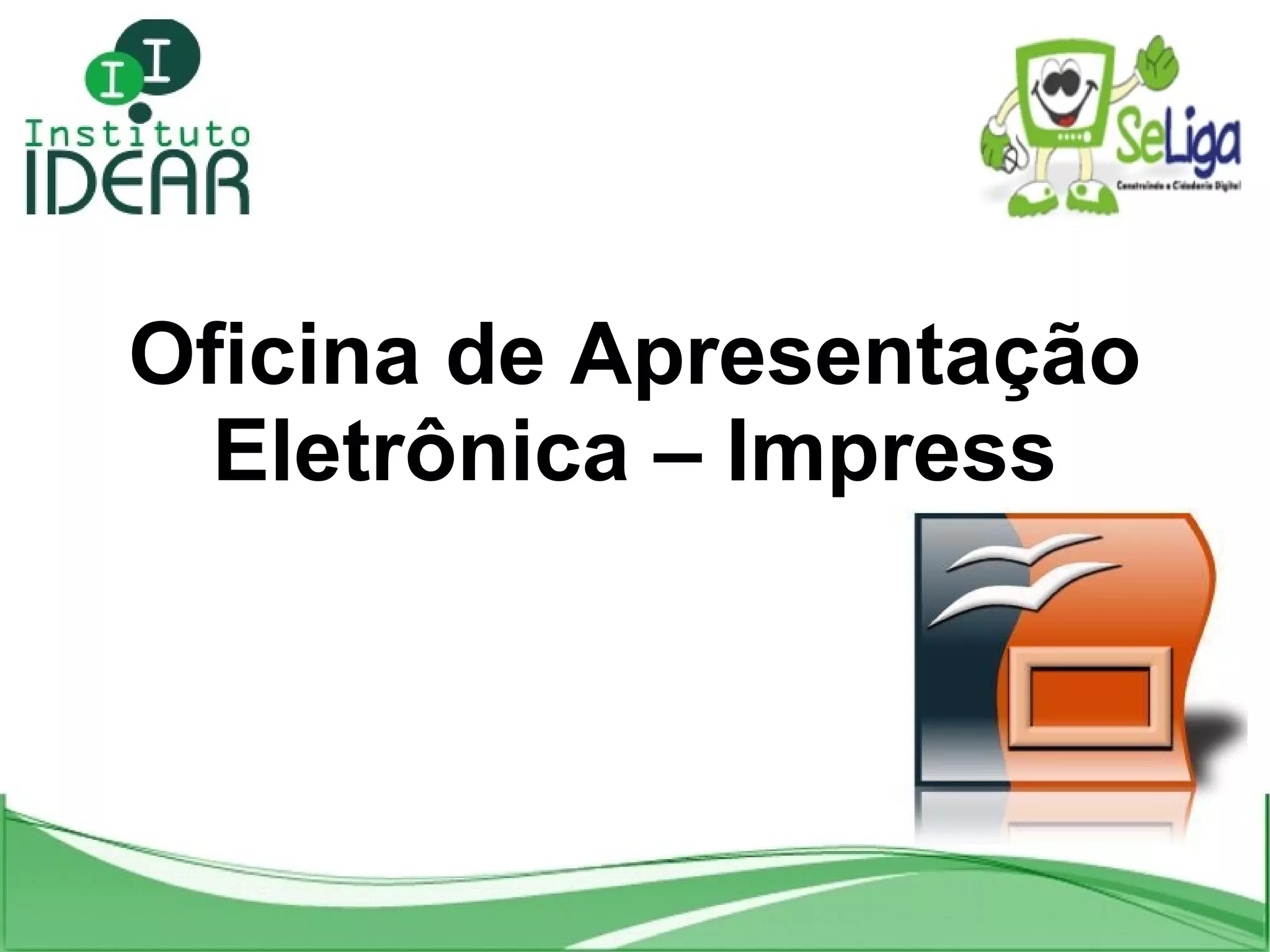 O documento descreve o software BrOffice Impress, que é usado para criar apresentações eletrônicas. Ele explica o que são apresentações e como o Impress pode ajudar a organizar e apresentar trabalhos escolares, palestras e demonstrações. Também fornece dicas sobre como adicionar texto, imagens e formatação em slides e como criar uma boa apresentação.