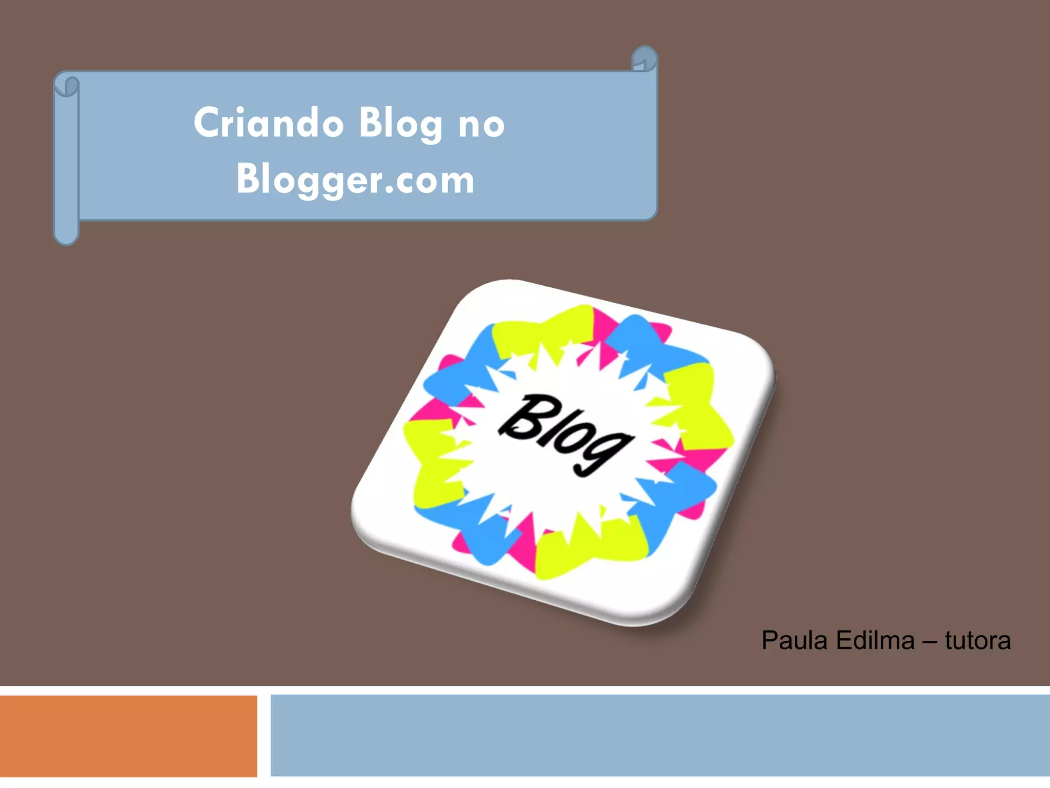 O documento fornece instruções passo a passo para criar um blog no Blogger.com, incluindo como se cadastrar, escolher um nome e endereço para o blog, adicionar elementos como foto e biografia, organizar as barras, fazer postagens, visualizar e salvar alterações.