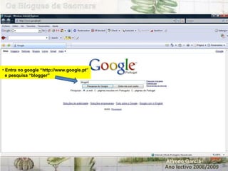 O documento fornece instruções passo-a-passo para criar um blog no Blogger. Explica como escolher um modelo, adicionar um título, escrever uma postagem e publicá-la, de forma que os leitores possam vê-la. Também mostra como modificar as configurações e o esquema do blog depois de criado.