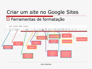 Este documento fornece instruções sobre como criar um site no Google Sites. Explica como inserir imagens, vídeos, hiperligações e outros elementos. Detalha como formatar texto, alterar o esquema da página e definir configurações. Fornece também dicas sobre como editar e gerir páginas e o site como um todo.