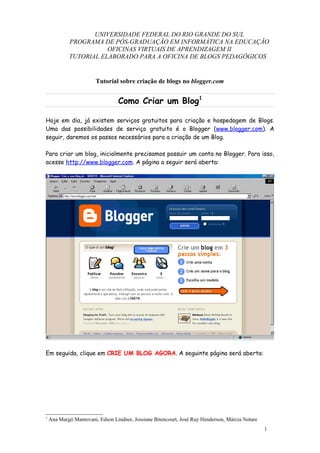 Este documento fornece instruções passo a passo para criar um blog gratuito no serviço Blogger.com, incluindo como escolher um nome, modelo e configurações para o blog, publicar postagens e comentários, e convidar outros membros.